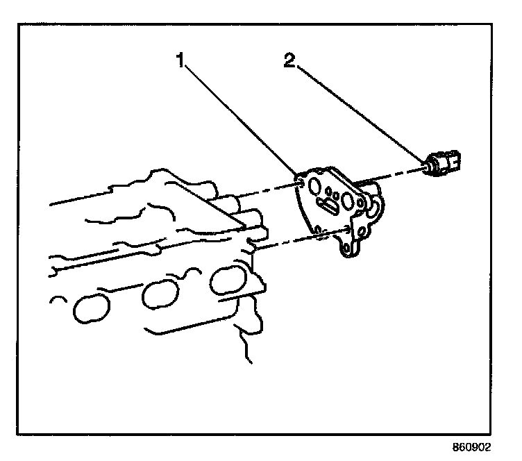 8. Remove the the rocker arm oil pressure switch (2) from the rocker arm oil control solenoid housing (1).