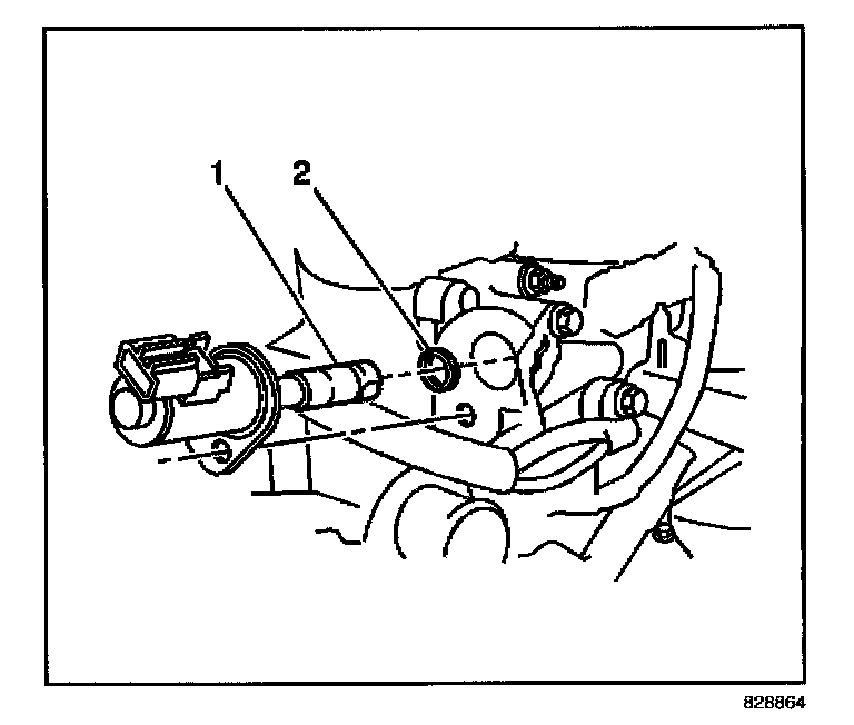 9. Remove the rocker arm oil control solenoid valve (1) and the O-ring (2) from the cylinder head.