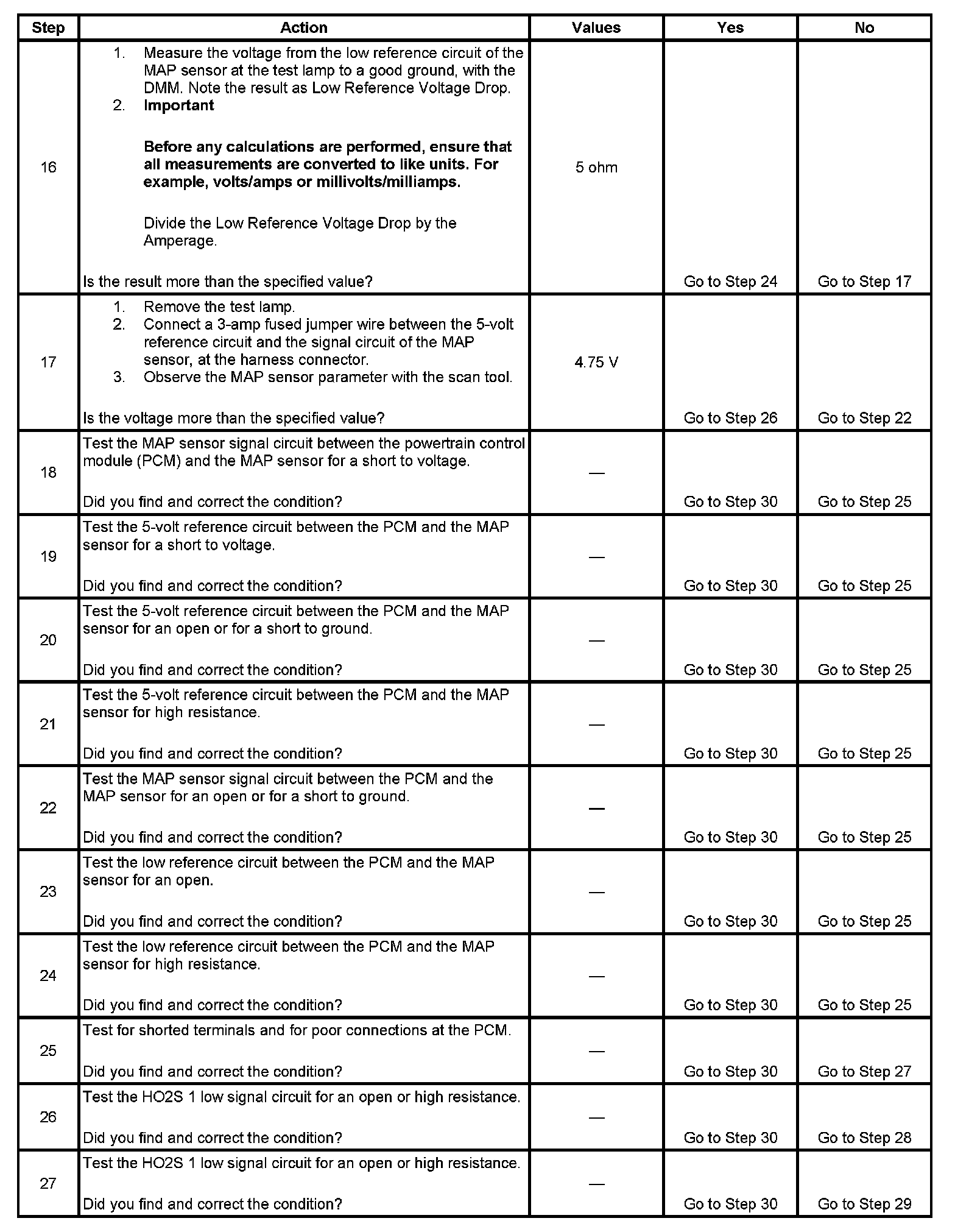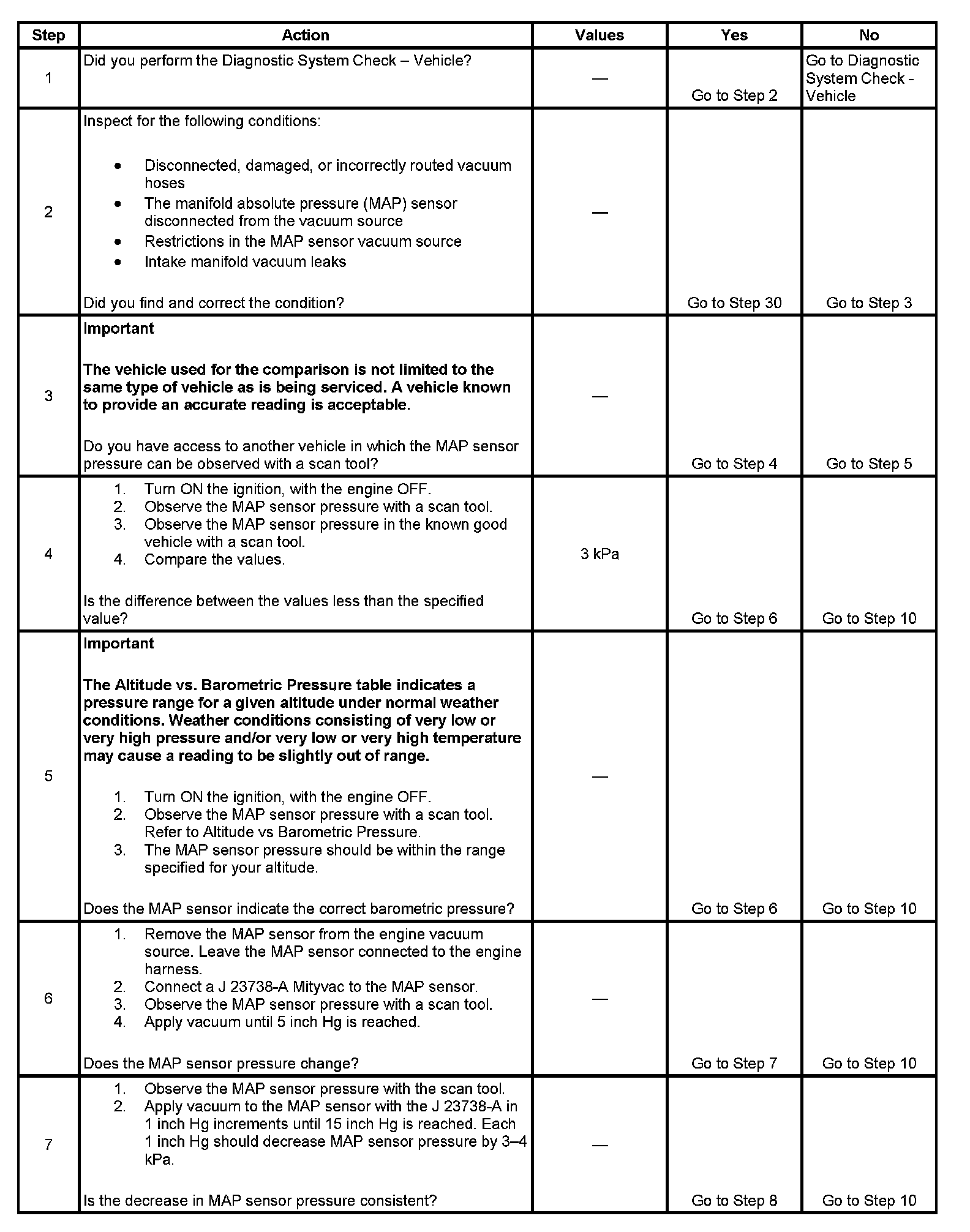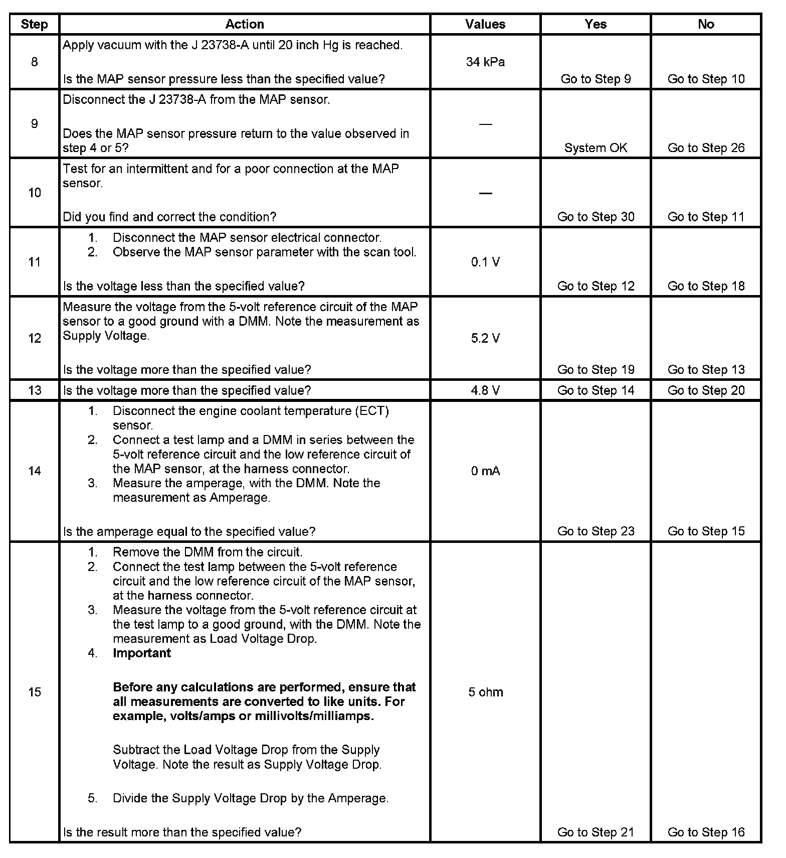 The manifold absolute pressure (MAP) sensor responds to changes in intake manifold pressure which gives an indication of the engine load. The MAP sensor has a 5-volt reference circuit, a low reference circuit, and a signal circuit. The powertrain control module (PCM) supplies 5 volts to the MAP sensor on the 5-volt reference circuit and provides a ground on the low reference circuit. The MAP sensor provides a signal to the PCM on the MAP sensor signal circuit, which is relative to the pressure changes in the manifold. With low MAP, such as during idle or deceleration, the PCM should detect a low MAP sensor signal voltage. With high MAP, such as ignition ON, engine OFF, or wide open throttle (WOT), the PCM should detect a high MAP sensor signal voltage. This MAP sensor will indicate pressure between 10-104 kPa. The MAP sensor is also used in order to calculate the barometric pressure (BARO) when the ignition switch is turned ON, with the engine OFF. The BARO reading may also be updated whenever the engine is operated at WOT. The PCM monitors the MAP sensor signal for voltage outside of the normal range. If the PCM detects a MAP sensor signal voltage that is excessively low, DTC P0107 sets. If the PCM detects a MAP sensor signal voltage that is excessively high, DTC P0108 sets.