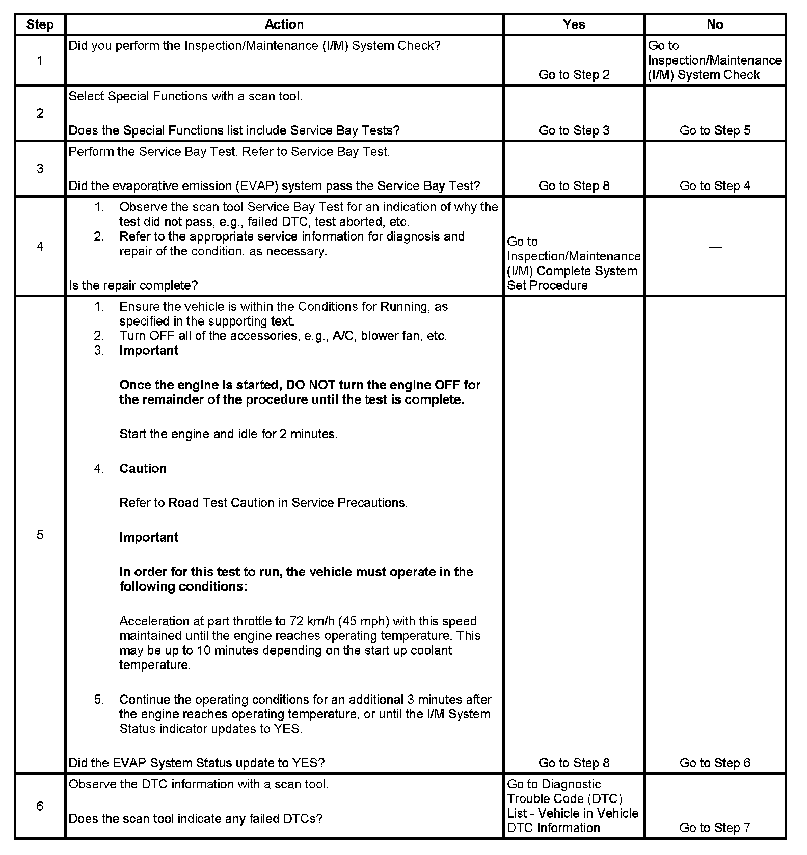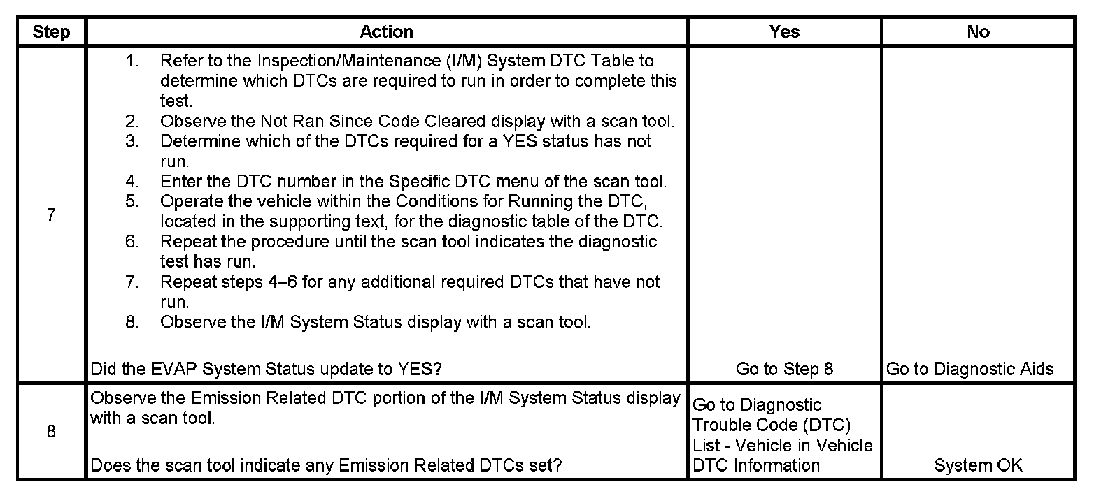 The purpose of this test is to satisfy the enable criteria necessary to execute inspection/maintenance (I/M) readiness diagnostics for the evaporative emission (EVAP) system. The test may be used to set the I/M System Status indicators to YES. The I/M System Status display on the scan tool indicates whether or not the control module has completed the required test. The required test is complete when either all of the DTCs comprising the test have run and passed, or when any one of the DTCs comprising the test has illuminated the malfunction indicator lamp (MIL). Once the test is complete, the I/M System Status display will indicate YES in the completed column. Performing a visual inspection prior to running the EVAP test may prevent having to repeat the test due to the fact that a failed or aborted test will require the vehicle to cool down in order to meet the enable criteria to run another test.
