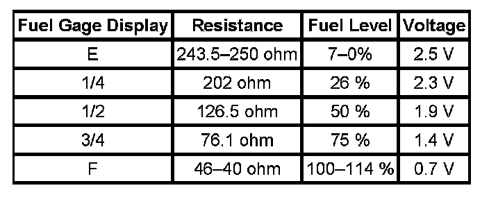 The information in this table is intended for use with the J 33431-C Signal Generator and Instrument Panel Tester. The fuel level sensor values represent the test values to be used on the Signal Generator to drive the fuel gage display to the indicated positions. Vehicles that require more than one fuel level sensor calculate gage position from many possible resistance combinations of fuel levels between the two tanks. Therefore, the values in the table may not correlate directly to readings taken from the vehicle primary or secondary sending units.