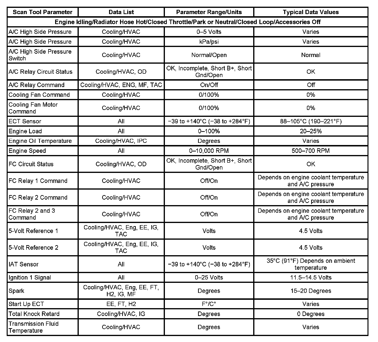 Scan tool values from a properly functioning engine cooling system may be used for comparison with the system you are diagnosing. The Engine Cooling Scan Tool Data List represents values that would be seen on a normal system.