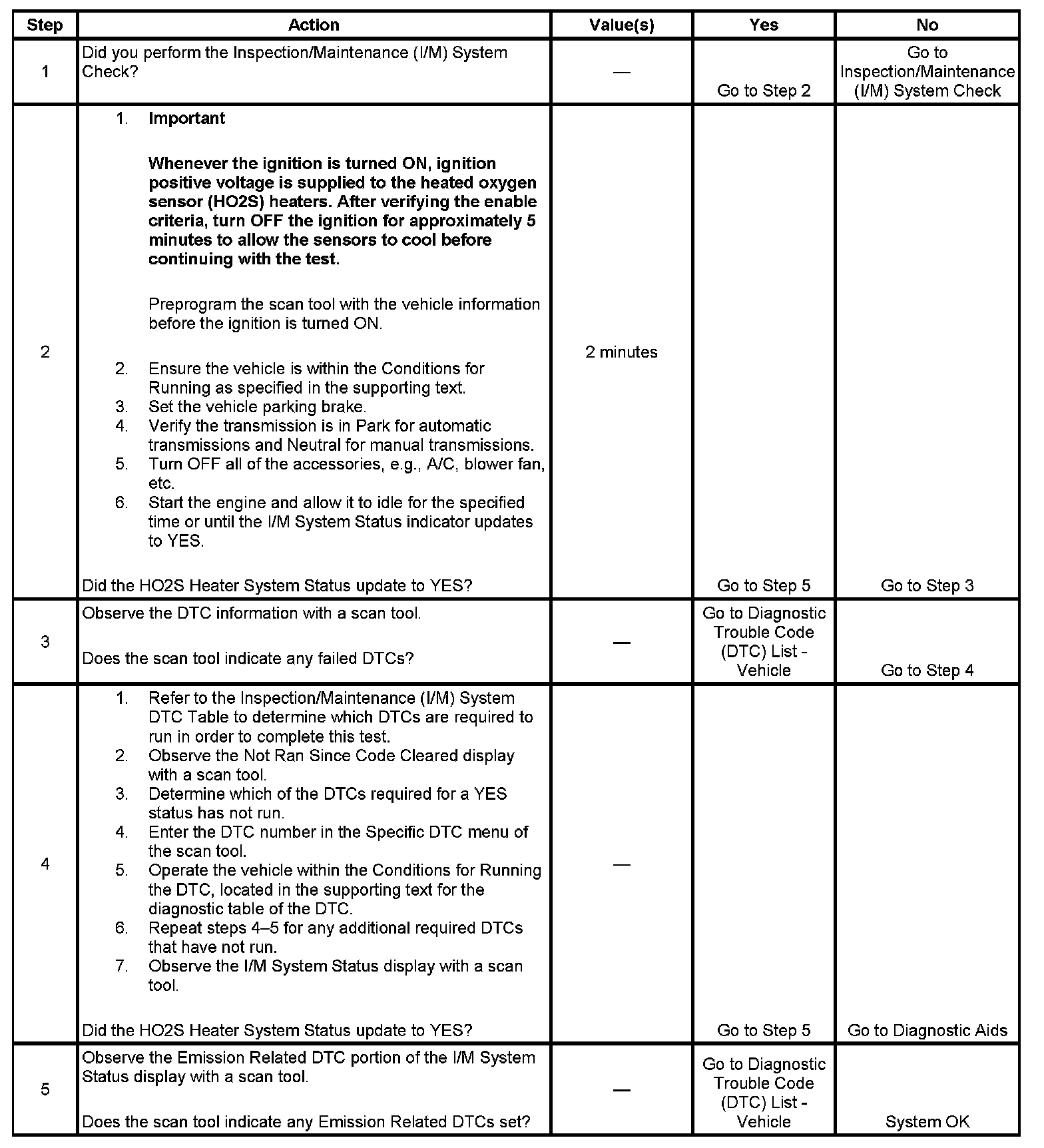 The purpose of this test is to satisfy the enable criteria necessary to execute inspection/maintenance (I/M) readiness diagnostics for the heated oxygen sensor (HO2S) system. The test may be used to set the I/M System Status to YES. The I/M System Status display on the scan tool provides an indication of whether the control module has completed the required tests. The I/M System Status does not indicate that the tests have passed or failed. When all of the diagnostics for a specific system have run and passed, the I/M System Status will update to YES. If a test for a specific system has failed, the I/M System Status will update to YES, indicating a determination was made, even if all of the other tests for that system have not run.