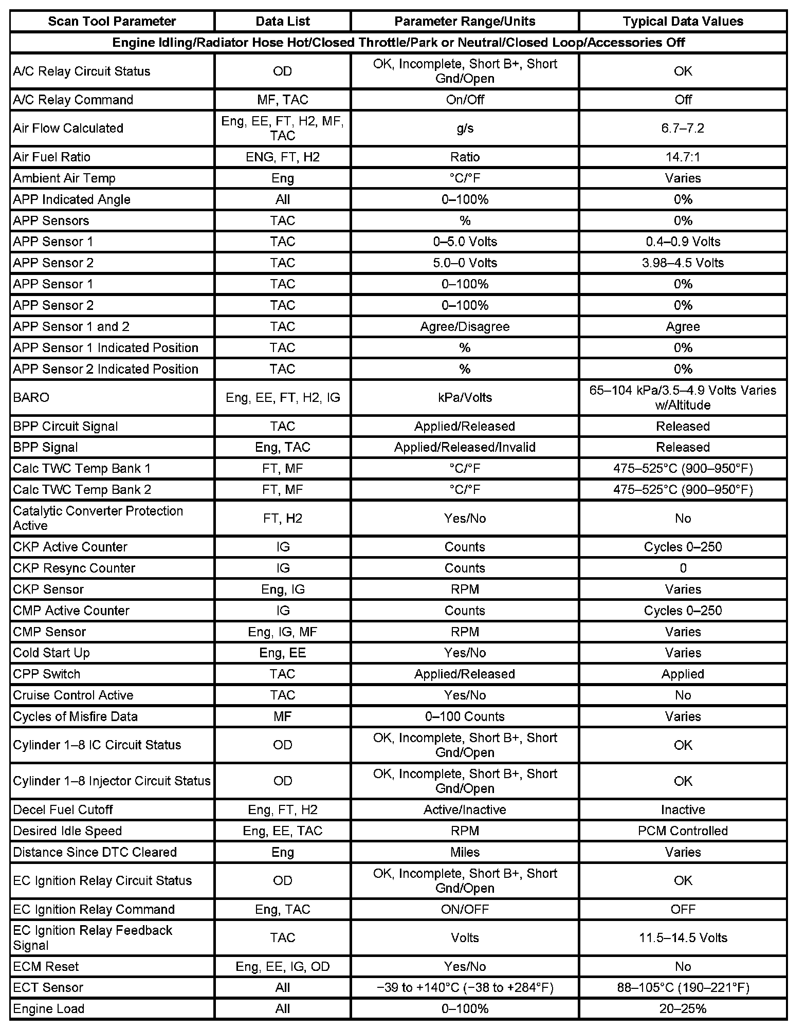 Scan tool values from a properly running engine may be used for comparison with the engine you are diagnosing. The Engine Scan Tool Data List represents values that would be seen on a normal running engine.