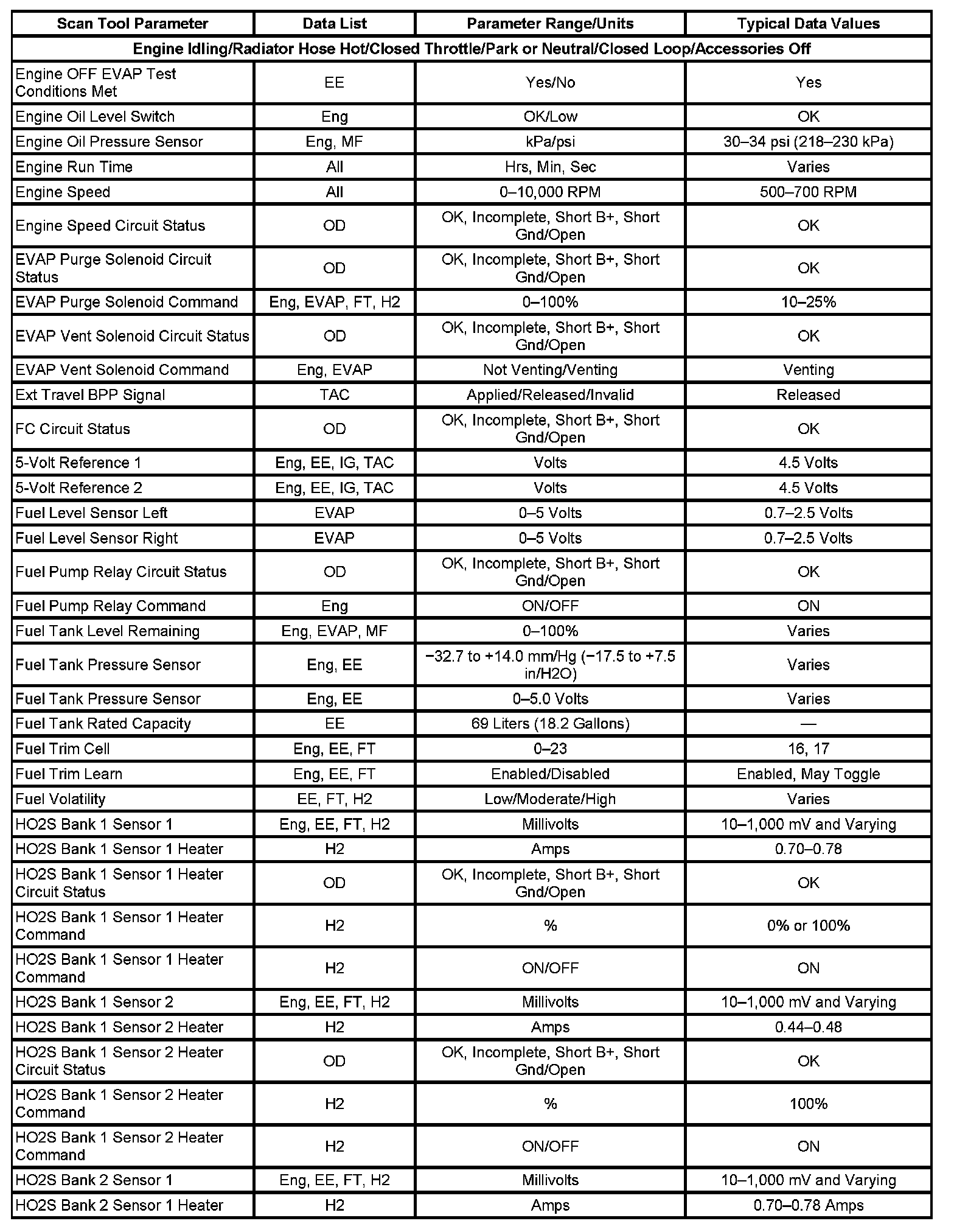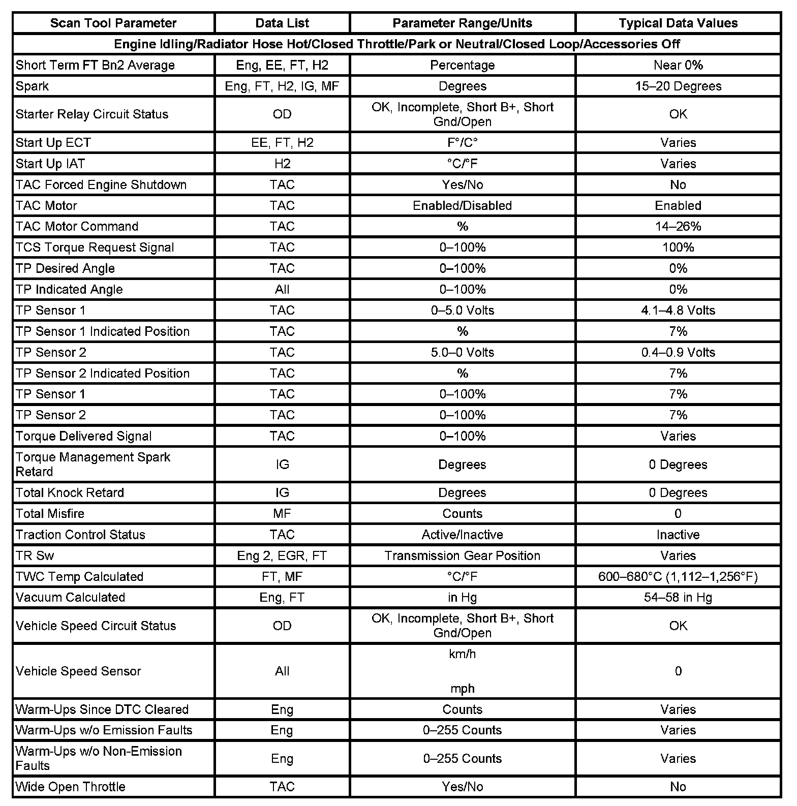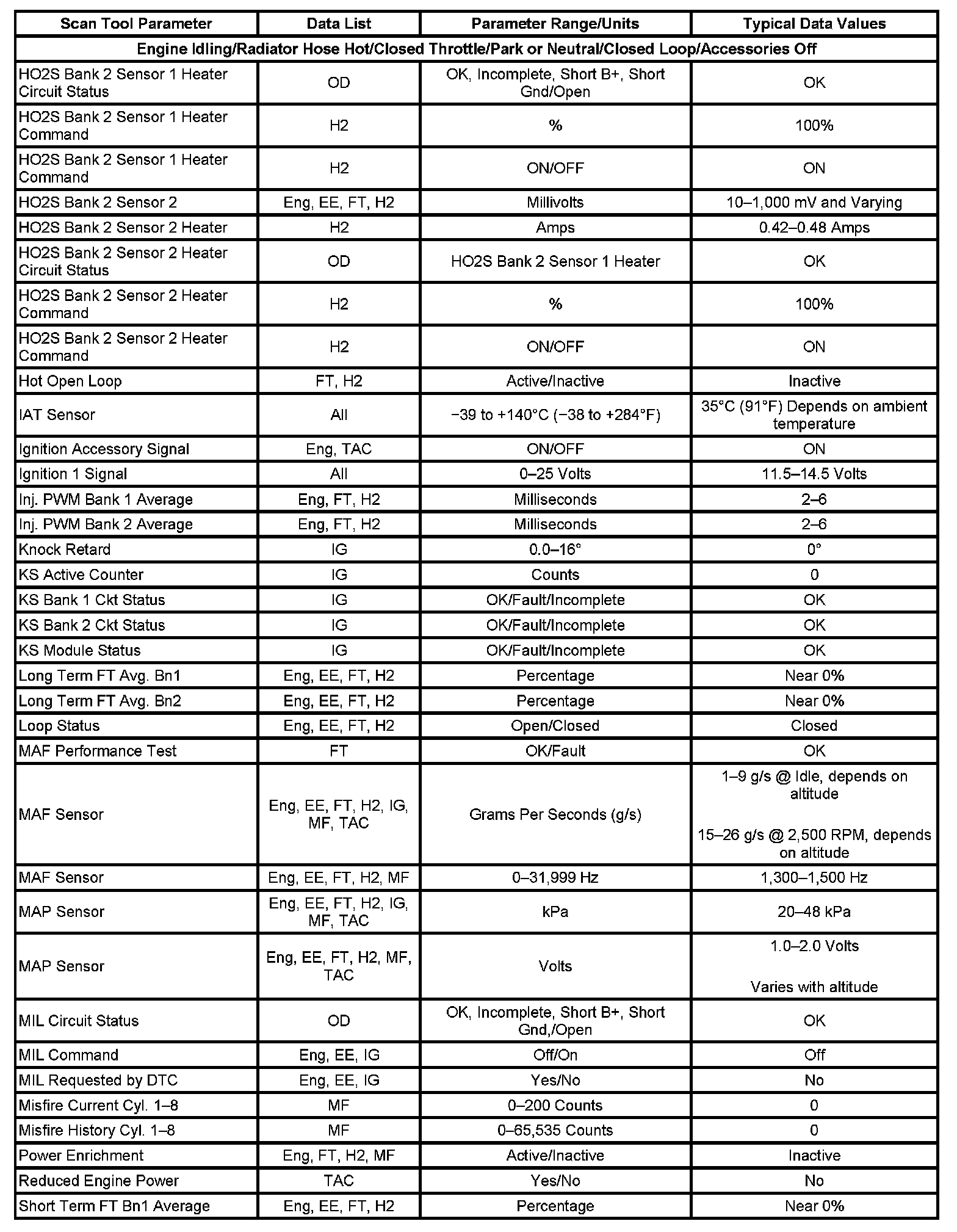 The Engine Scan Tool Data List contains all engine related parameters that are available on the scan tool. The list is arranged in alphabetical order. A given parameter may appear in any one of the data lists, and in some cases may appear more than once, or in more than one data list in order to group certain related parameters together.