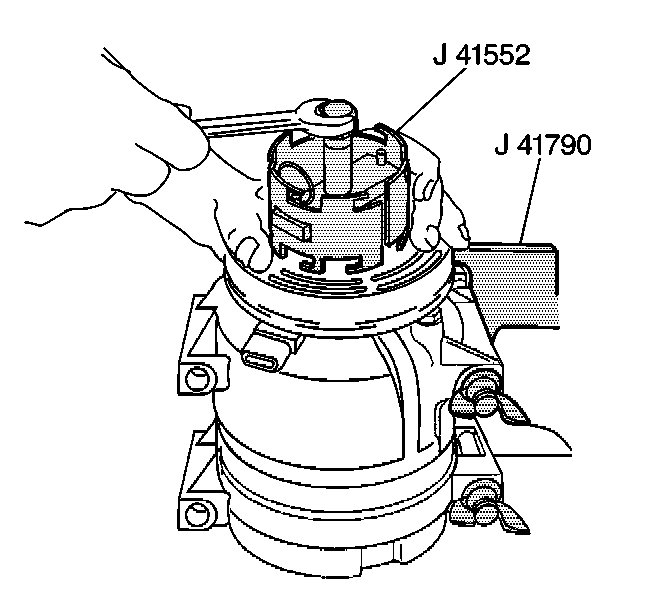 6. Hold the compressor pulley puller in place and use a wrench to turn the center forcing screw against the puller pilot to remove the clutch rotor and bearing assembly.