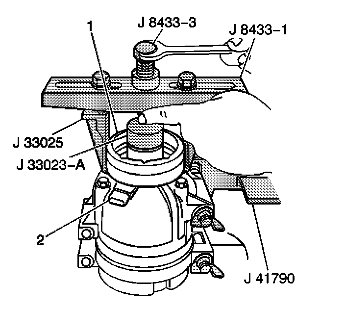 7. Install the J 8433 onto the compressor clutch coil (1) and tighten the puller leg bolts.