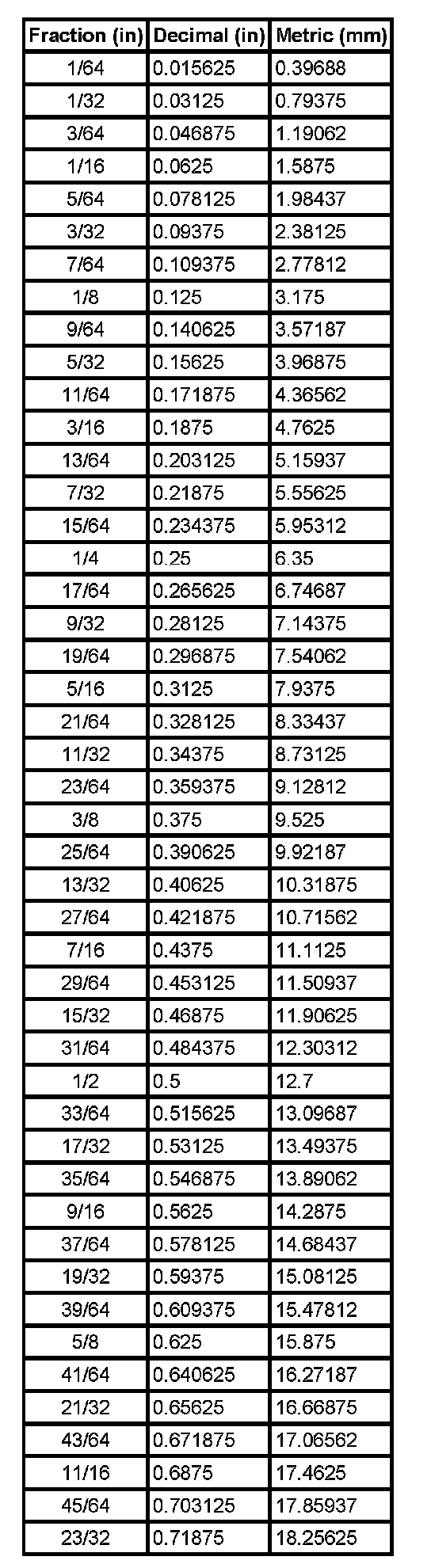 Equivalents - Decimal And Metric