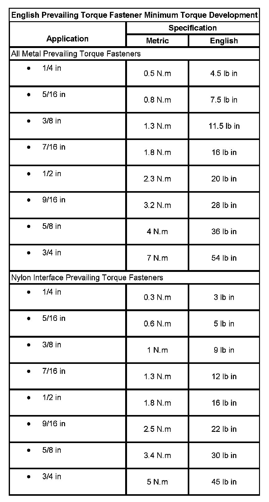 ENGLISH PREVAILING TORQUE FASTENER MINIMUM TORQUE DEVELOPMENT
