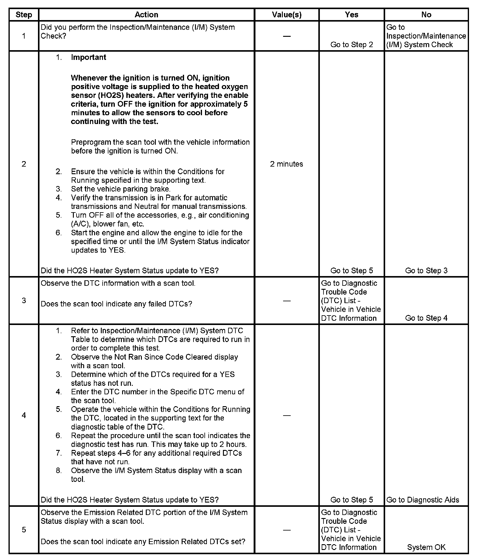 The purpose of this test is to satisfy the enable criteria necessary to execute inspection/maintenance (I/M) readiness diagnostics for the heated oxygen sensor (HO2S) heater system. The test may be used to set the I/M System Status to YES. The I/M System Status Display on the scan tool provides an indication of whether the control module has completed the required tests. The I/M System Status does not indicate that the tests have passed or failed. When all of the diagnostics for a specific system have run and passed the I/M System Status will update to YES. If a test for a specific system has failed, the I/M System Status will update to YES, indicating a determination was made, even if all of the other tests for that system have not run.