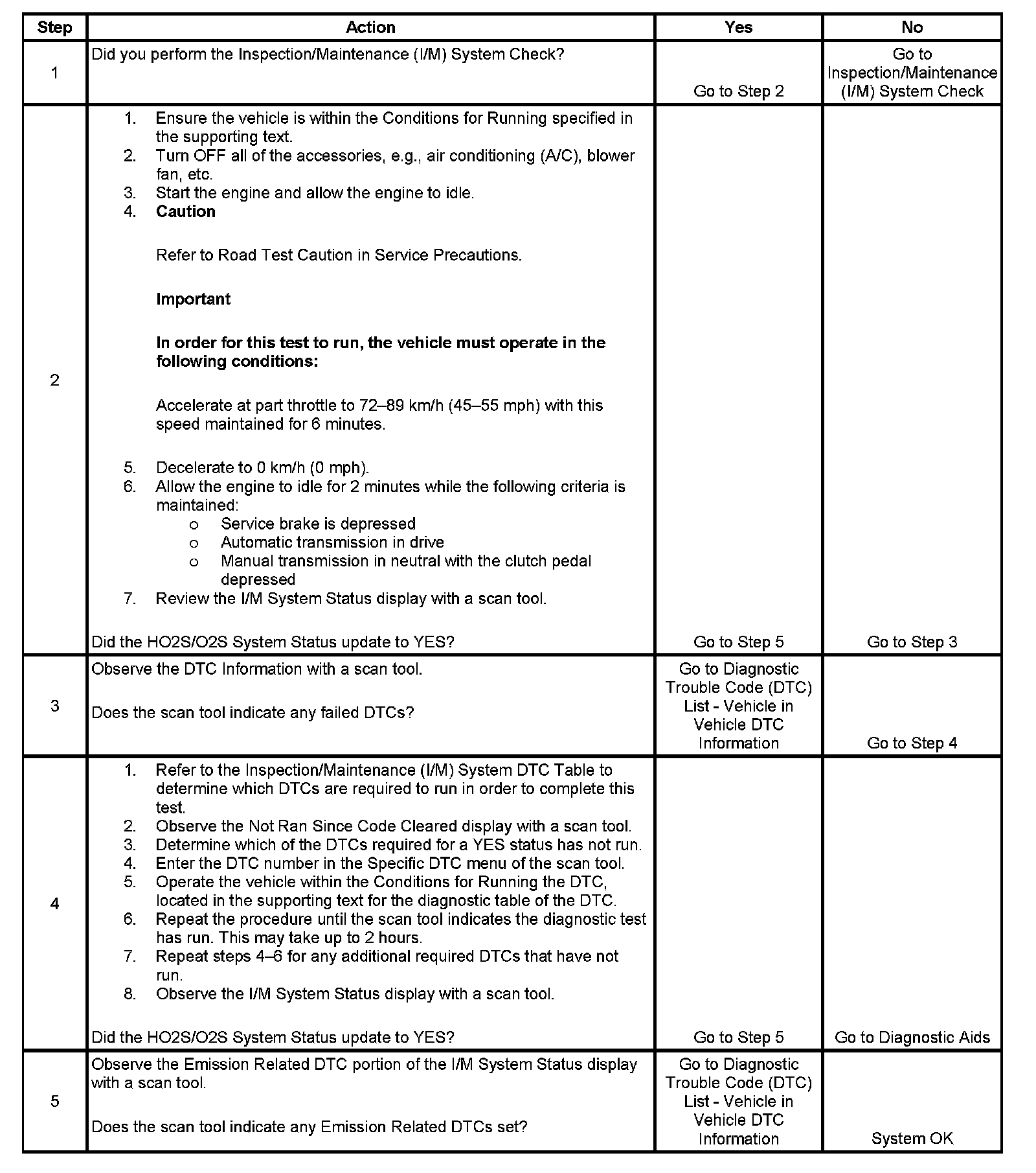 The purpose of this test is to satisfy the enable criteria necessary to execute inspection/maintenance (I/M) readiness diagnostics for the oxygen sensor/heated oxygen sensor (O2S/HO2S) system. The test may be used to set the I/M System Status to YES. The I/M System Status Display on the scan tool provides an indication of whether the control module has completed the required tests. The I/M System Status does not indicate that the tests have passed or failed. When all of the diagnostics for a specific system have run and passed the I/M System Status will update to YES. If a test for a specific system has failed, the I/M System Status will update to YES, indicating a determination was made, even if all of the other tests for that system have not run.