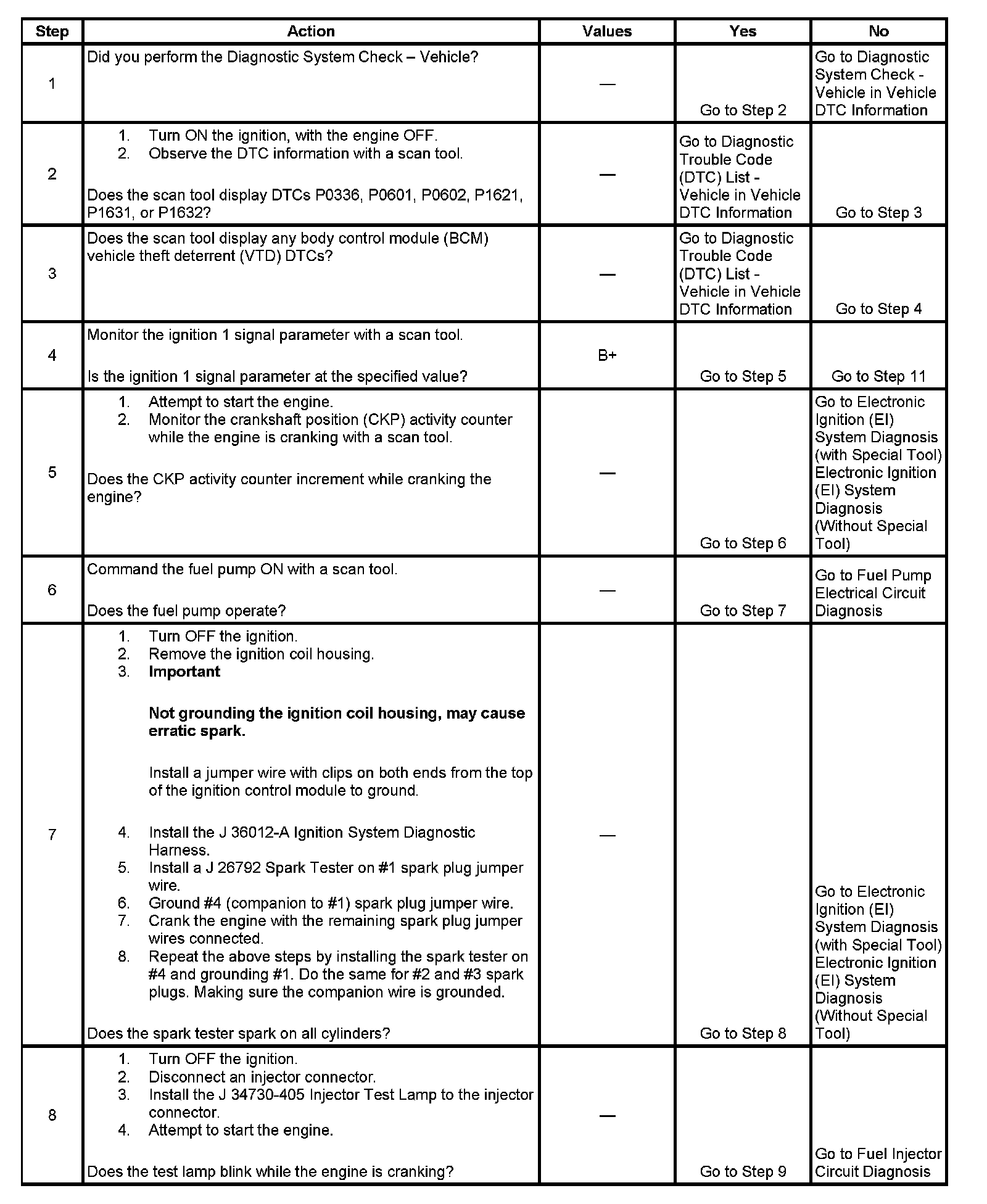 The Engine Cranks but Does Not Run diagnostic table assumes the following: