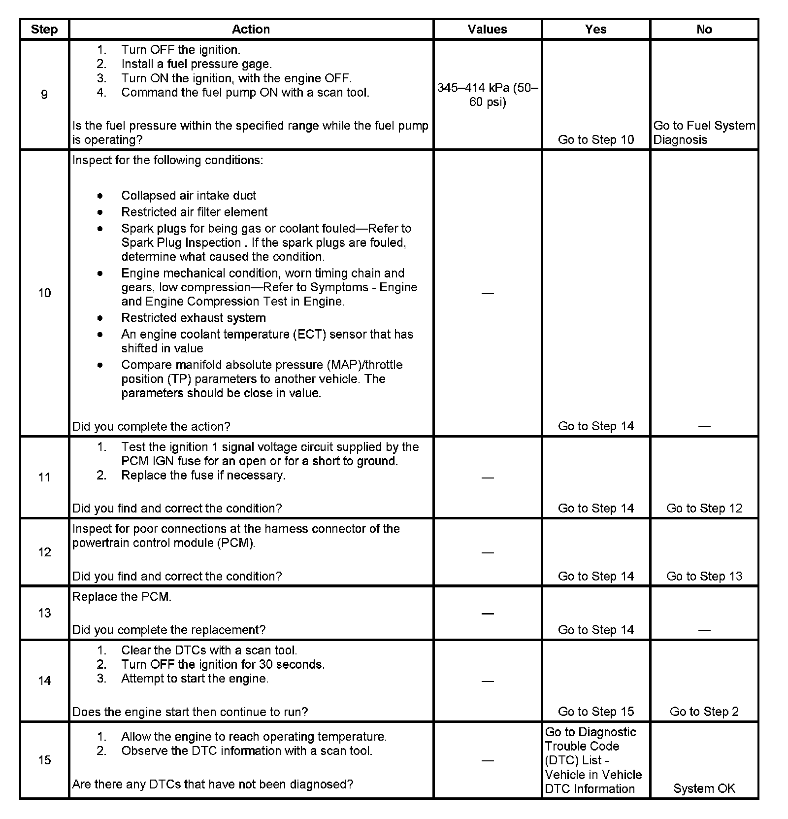 The Engine Cranks but Does Not Run diagnostic table is an organized approach to identifying a condition that causes an engine not to start. The Engine Cranks but Does Not Run diagnostic table directs the service technician to the appropriate system diagnosis.