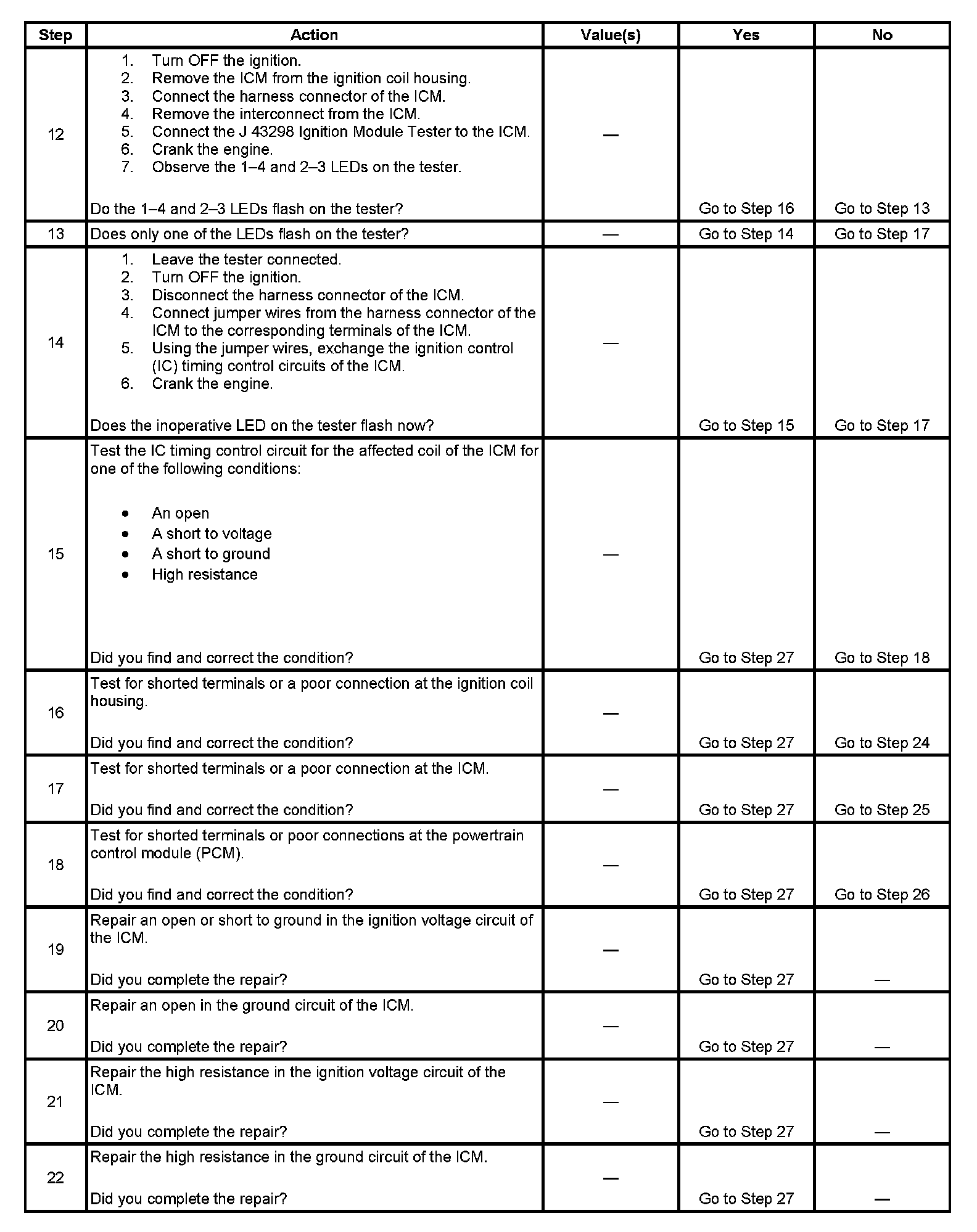 Each ignition coil supplies secondary voltage to a pair of spark plugs. This is called a waste spark ignition system. The powertrain control module (PCM) supplies a signal on each of the ignition control (IC) timing control circuits to the ignition control module (ICM). The ICM fires the correct ignition coil at the correct time based on the signals. The ICM detects if cylinder 1 or cylinder 3 is on the compression stroke by sensing the secondary voltage and polarity of each side of the ignition coil. The ICM detects this voltage with sensing circuitry integrated into each ignition coil. The higher voltage is on the compressing cylinder. This is called compression sense ignition. The ICM provides a synthesized cam signal to the PCM based on these inputs. The PCM uses the cam signal to synchronize fuel injection.