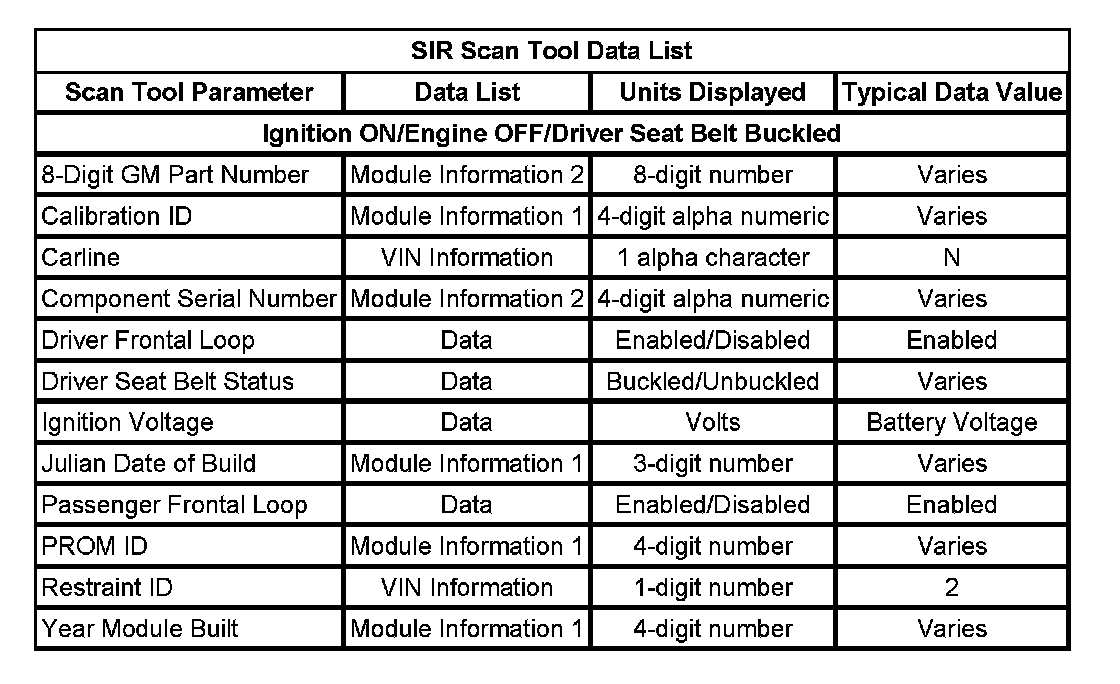 The SIR Scan Tool Data List contains all the restraint system related parameters that are available on the scan tool. The parameters in the list are arranged in alphabetical order. The column, "Data List," indicates the location of the parameter within the scan tool menu selections.