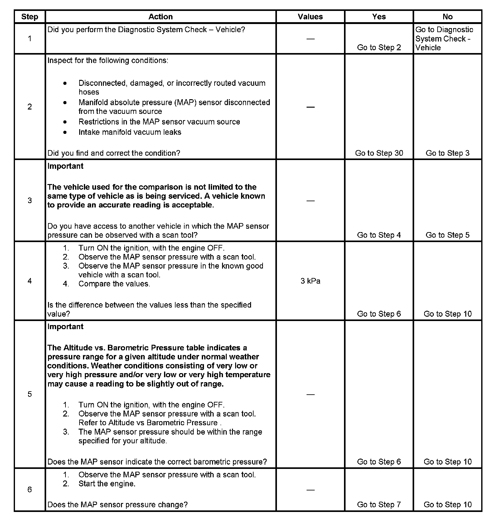 The manifold absolute pressure (MAP) sensor responds to changes in intake manifold pressure which gives an indication of the engine load. The MAP sensor has a 5-volt reference circuit, a low reference circuit, and a signal circuit. The powertrain control module (PCM) supplies 5 volts to the MAP sensor on the 5-volt reference circuit and provides a ground on the low reference circuit. The MAP sensor provides a signal to the PCM on the MAP sensor signal circuit, which is relative to the pressure changes in the manifold. With low MAP, such as during idle or deceleration, the PCM should detect a low MAP sensor signal voltage. With high MAP, such as ignition ON, engine OFF, or wide open throttle (WOT), the PCM should detect a high MAP sensor signal voltage. The MAP sensor is also used in order to calculate the barometric pressure (BARO) when the ignition switch is turned ON, with the engine OFF. The BARO reading may also be updated whenever the engine is operated at WOT. The PCM monitors the MAP sensor signal for voltage outside of the normal range. If the PCM detects a MAP sensor signal voltage that is excessively low, DTC P0107 sets. If the PCM detects a MAP sensor signal voltage that is excessively high, DTC P0108 sets.