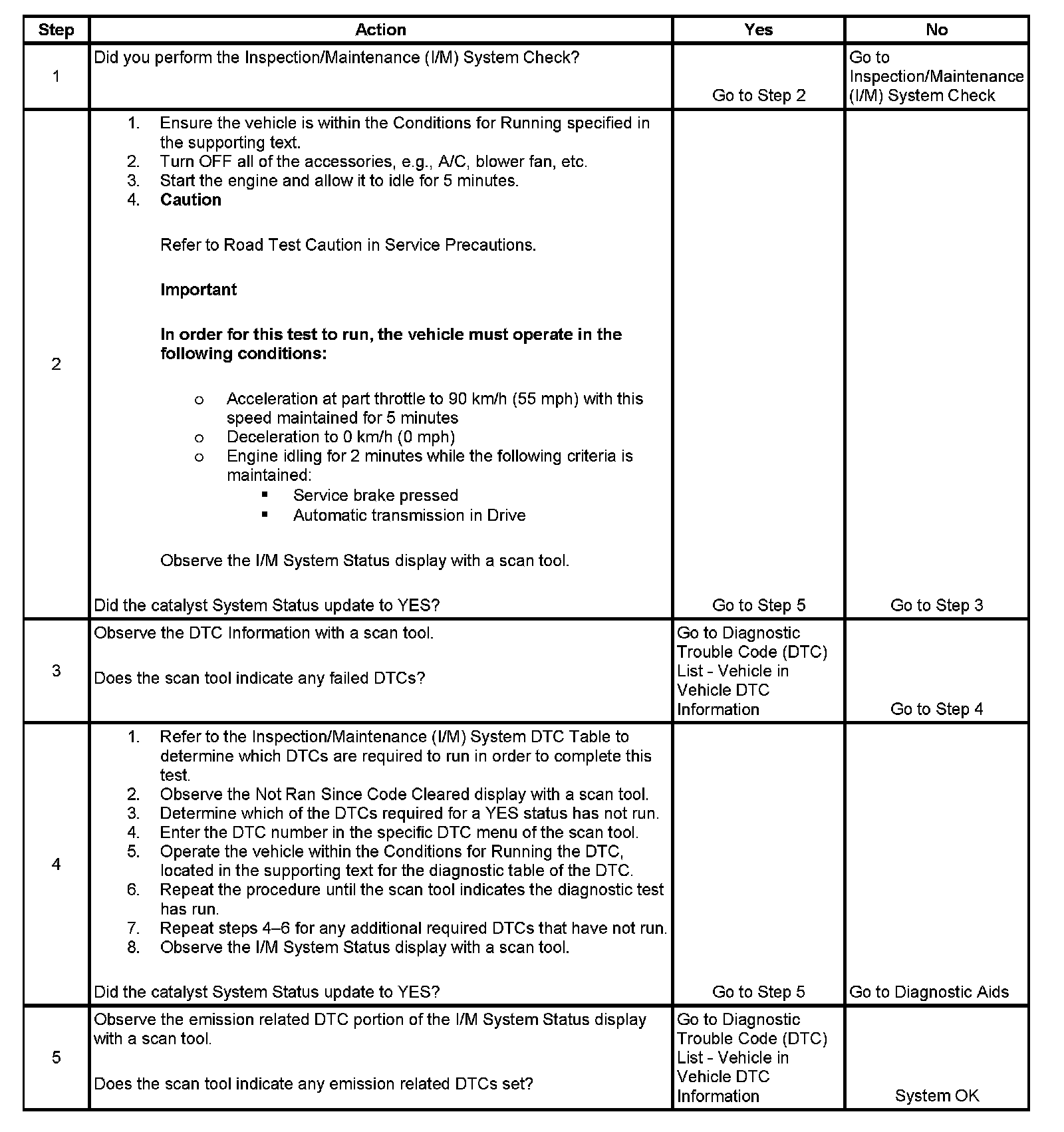 The purpose of this test is to satisfy the enable criteria necessary to execute inspection/maintenance (I/M) readiness diagnostics for the catalyst system. The test may be used to set the I/M System Status indicators to YES. The I/M System Status display on the scan tool provides an indication of whether the control module has completed the required tests. The I/M System Status does not indicate that the tests have passed or failed. When all of the diagnostics for a specific system have run and passed, the I/M System Status will update to YES. If a test for a specific system has failed, the I/M System Status will update to YES, indicating a determination was made even if all of the other tests for that system have not run.