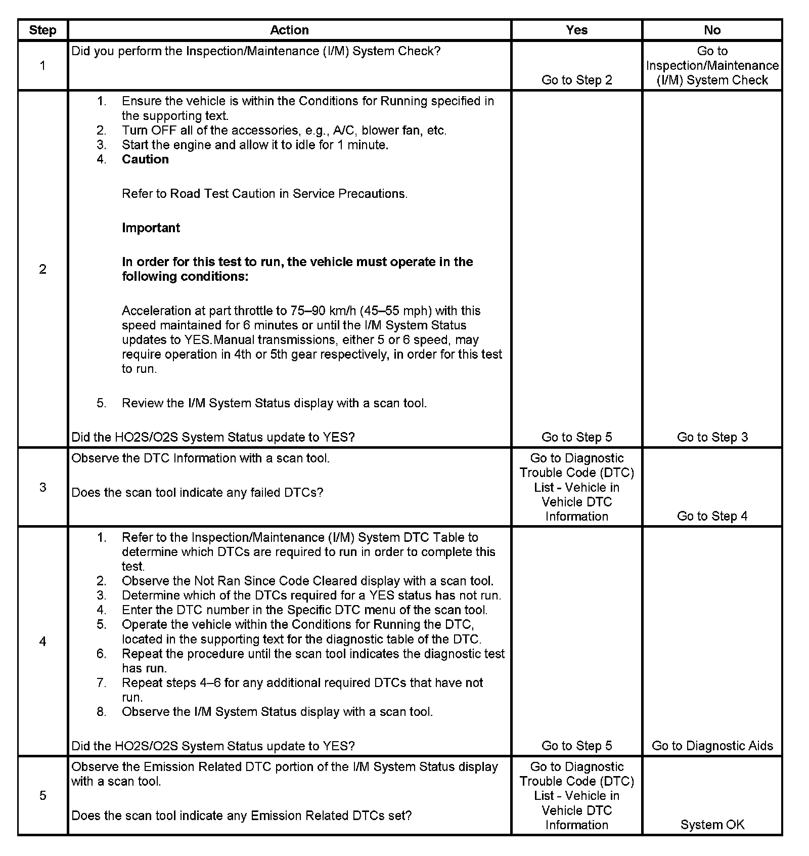 The purpose of this test is to satisfy the enable criteria necessary to execute inspection/maintenance (I/M) readiness diagnostics for the oxygen sensor (O2S, HO2S) system. The test may be used to set the I/M System Status to YES. The I/M System Status display on the scan tool provides an indication of whether the control module has completed the required tests. The I/M System Status does not indicate that the tests have passed or failed. When all of the diagnostics for a specific system have run and passed, the I/M System Status will update to YES. If a test for a specific system has failed, the I/M System Status will update to YES, indicating a determination was made, even if all of the other tests for that system have not run.