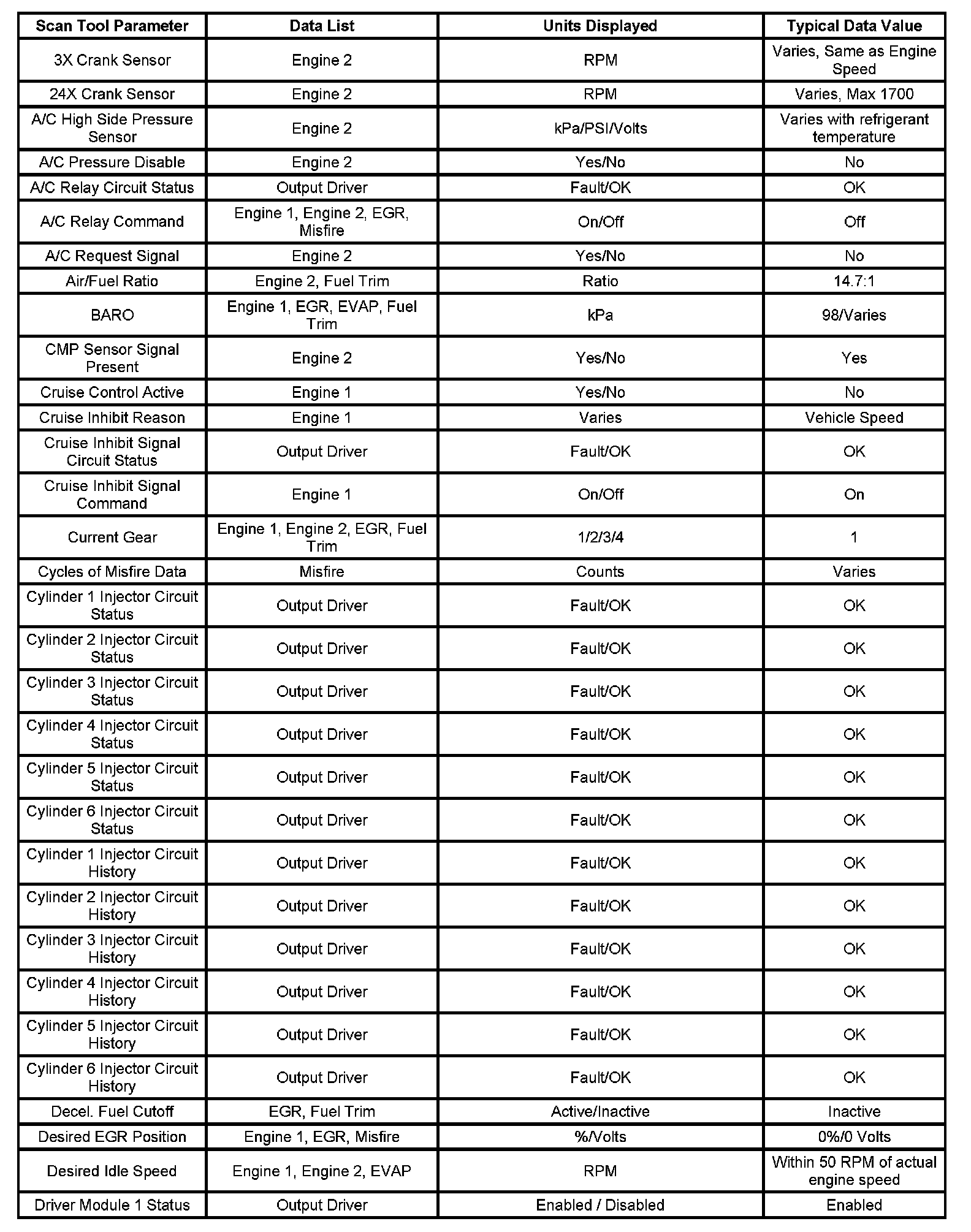 - EGR Data-Contains information specific to the exhaust gas recirculation (EGR) system. This list displays parameters required to verify proper EGR system operation.