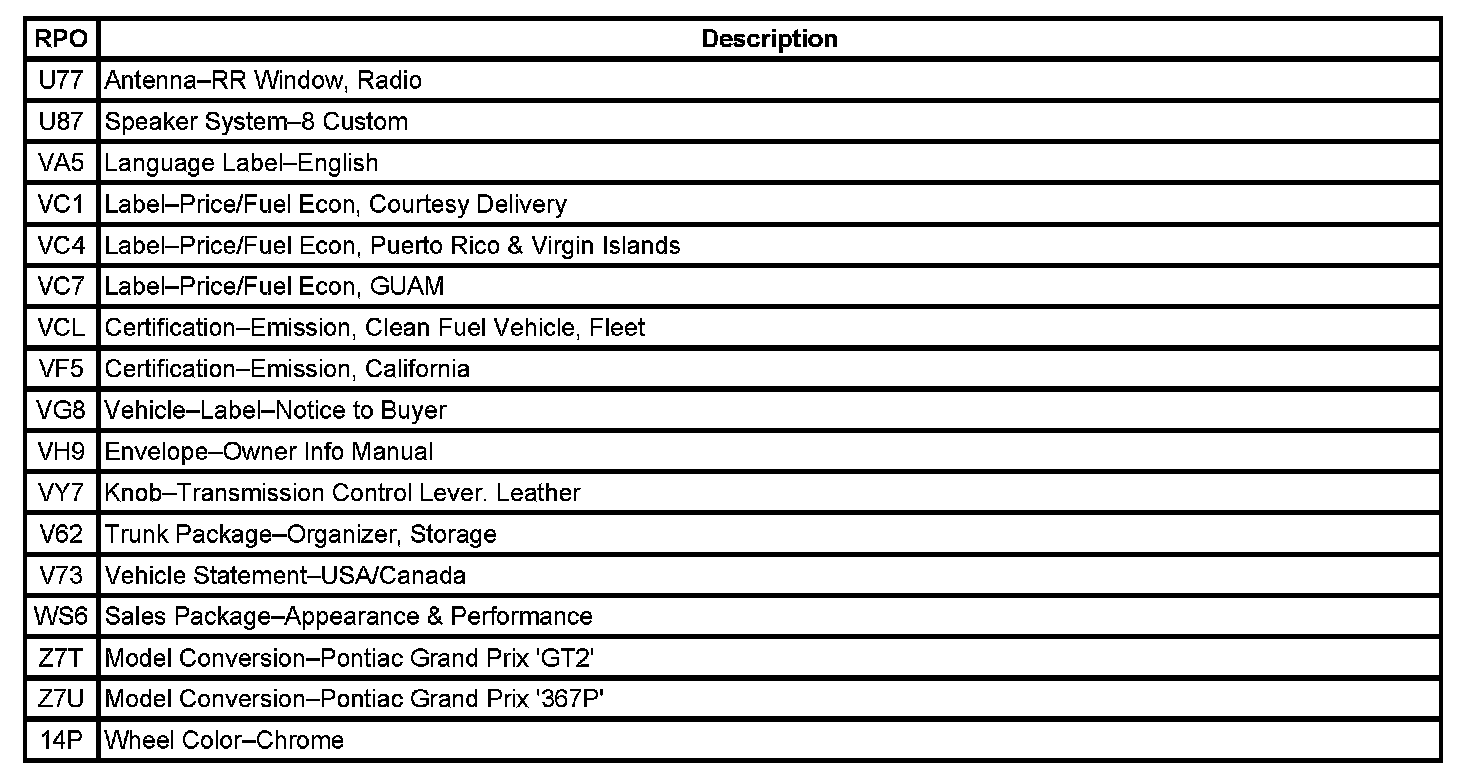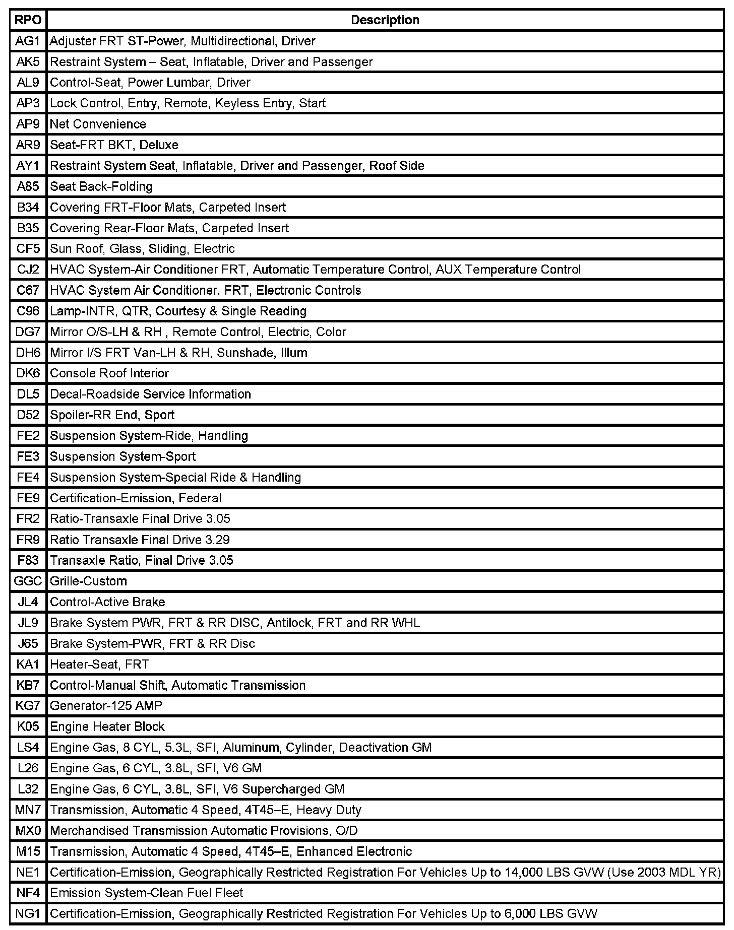 RPO Code List Part 1: