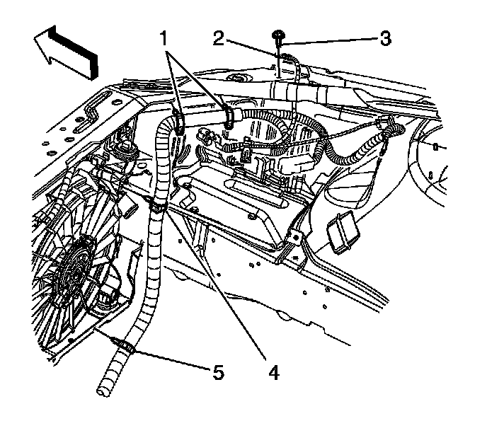 11. Remove the battery cable harness retaining clips (1, 4, and 5) from the front rail and fan shroud.