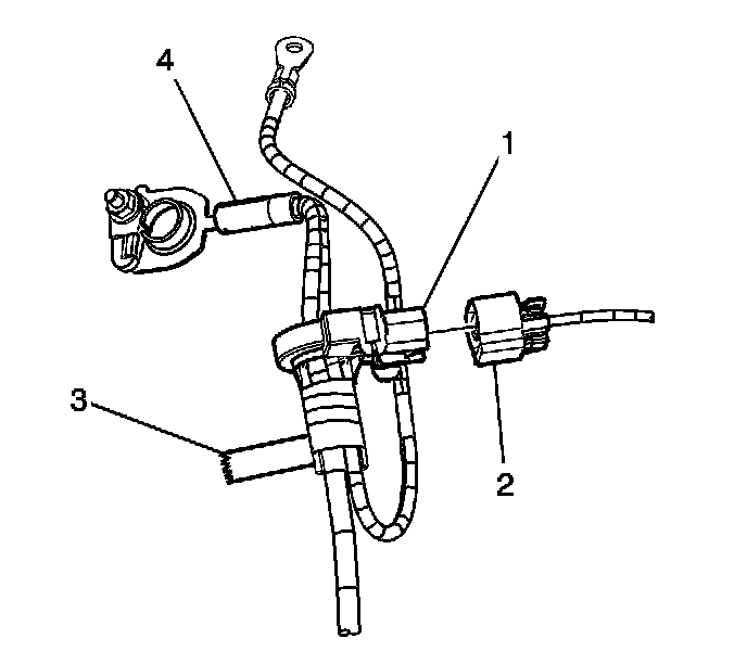 3. Remove the tape (3) securing the battery current sensor (1) to the negative battery cable (4).