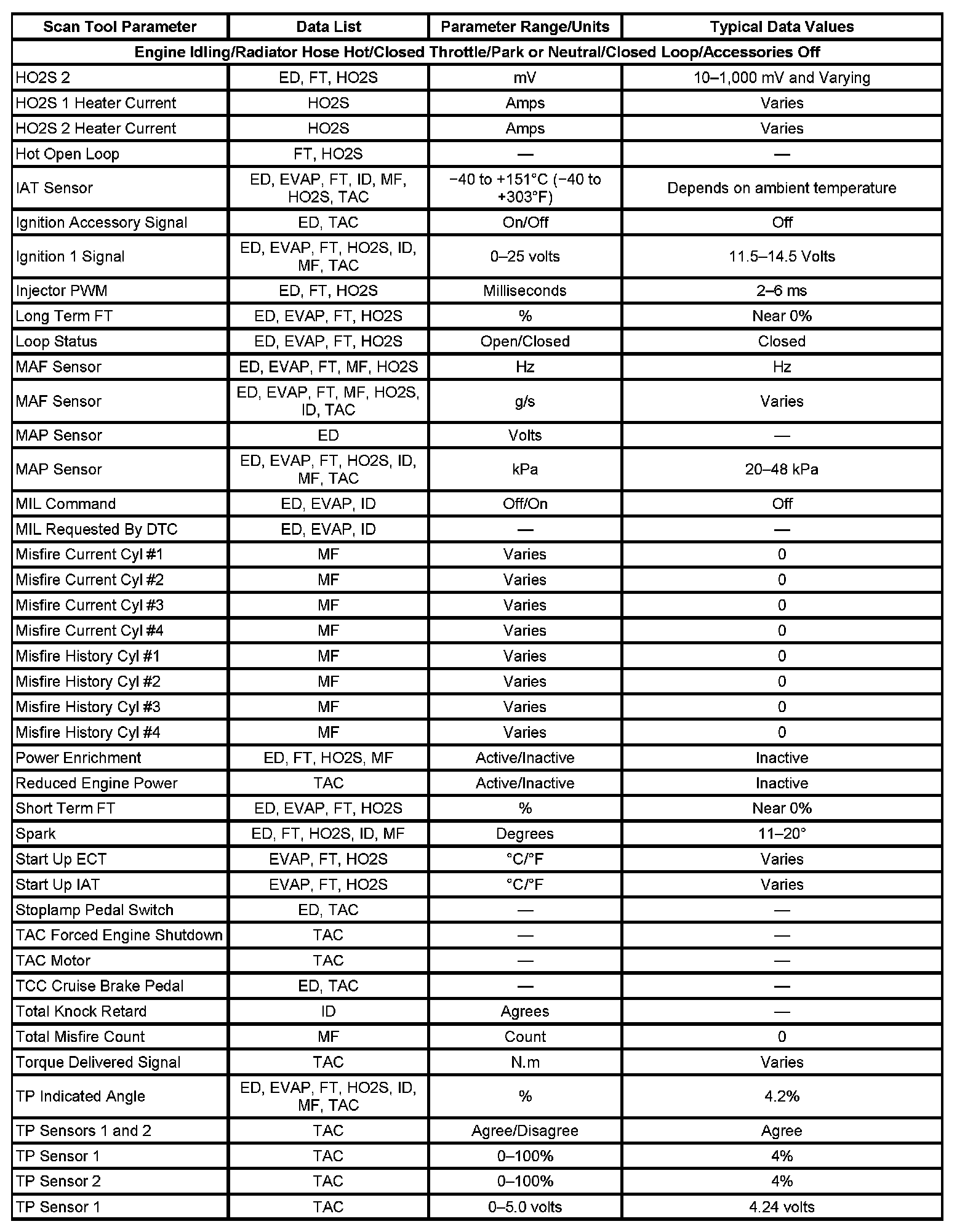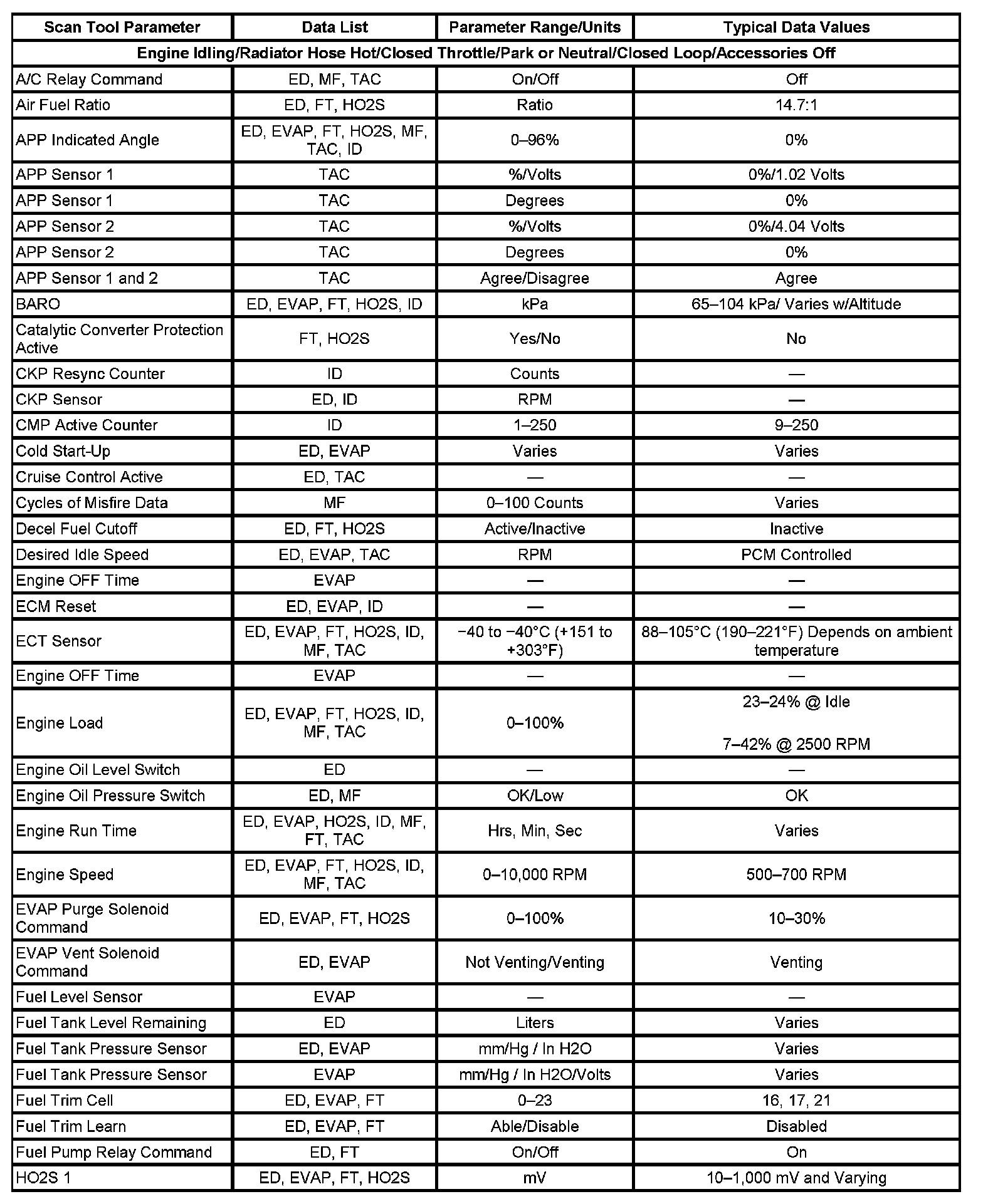 The Engine Scan Tool Data List contains all engine related parameters that are available on the scan tool. The list is arranged in alphabetical order. A given parameter may appear in any one of the data lists, and in some cases may appear more than once, or in more than one data list in order to group certain related parameters together.