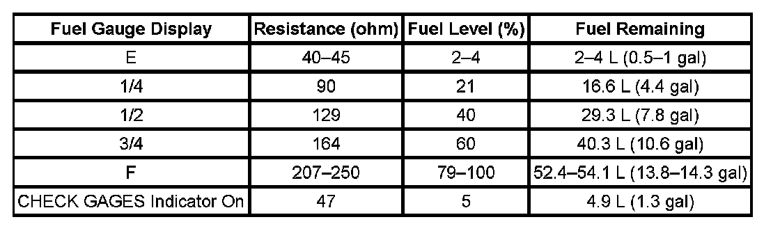 The information in this table is intended for use with the J 33431-C Signal Generator and Instrument Panel Tester. The fuel level sensor values represent the test values to be used on the Signal Generator to drive the fuel gage display to the indicated positions. Vehicles that require more than one fuel level sensor calculate gage position from many possible resistance combinations of fuel levels between the two tanks. Therefore, the values in the table may not correlate directly to readings taken from the vehicle primary or secondary sending units.