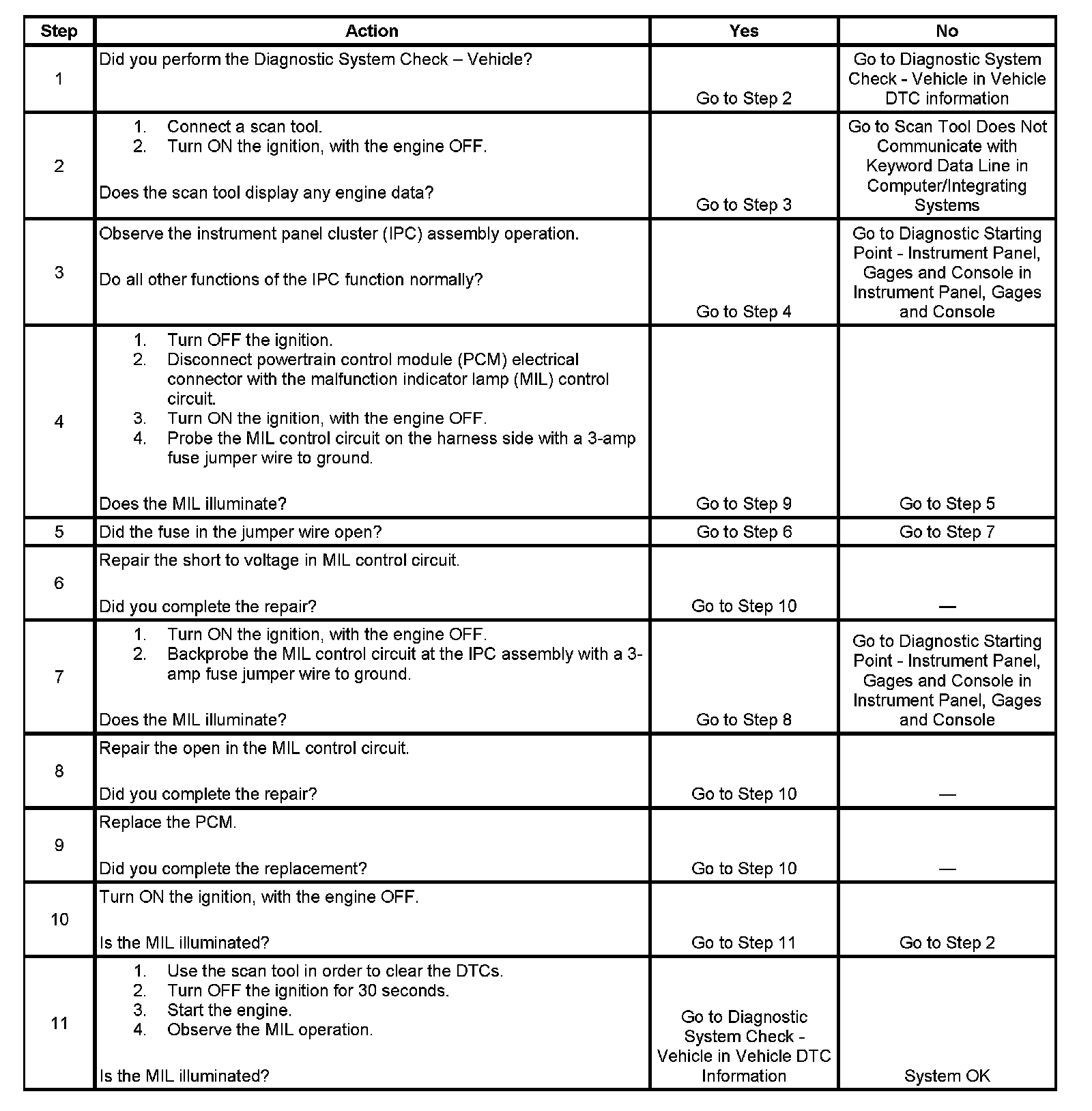 4. This step checks for an open MIL control circuit or for an internal PCM failure.
