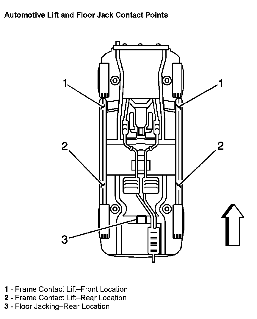- Perform the vehicle lifting or jacking procedure only at the identified lift points. DO NOT allow the lifting equipment or jacking equipment to contact any other vehicle components.