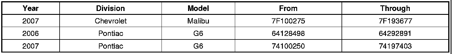 Involved are certain 2006-2007 model year Pontiac G6 vehicles equipped with a 2.4L 4 cylinder engine (LE5 - VIN B), and 2007 model year Chevrolet Malibu vehicles equipped with a 2.2L 4-cylinder engine (L61 - VIN F) that are registered in California, and built within these VIN breakpoints: