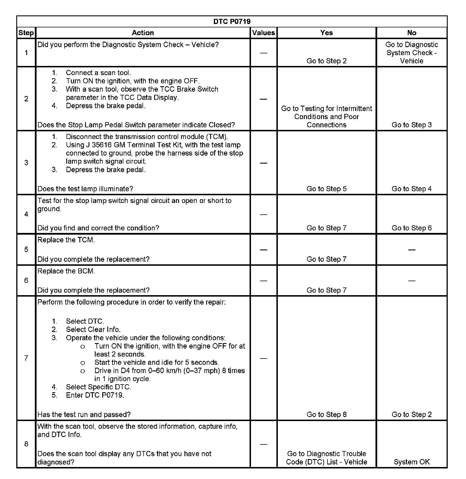 When the TCM detects an open or short to ground on the stop lamp switch signal circuit during stopping, then DTC P0719 sets. DTC P0719 is a type C DTC.