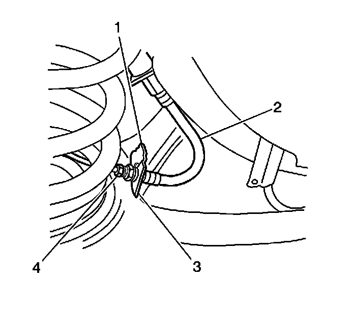 6. Disconnect the brake line (4) from the brake hose (2) at the rear suspension control arm bracket (3) and remove the brake hose retaining clip (1).