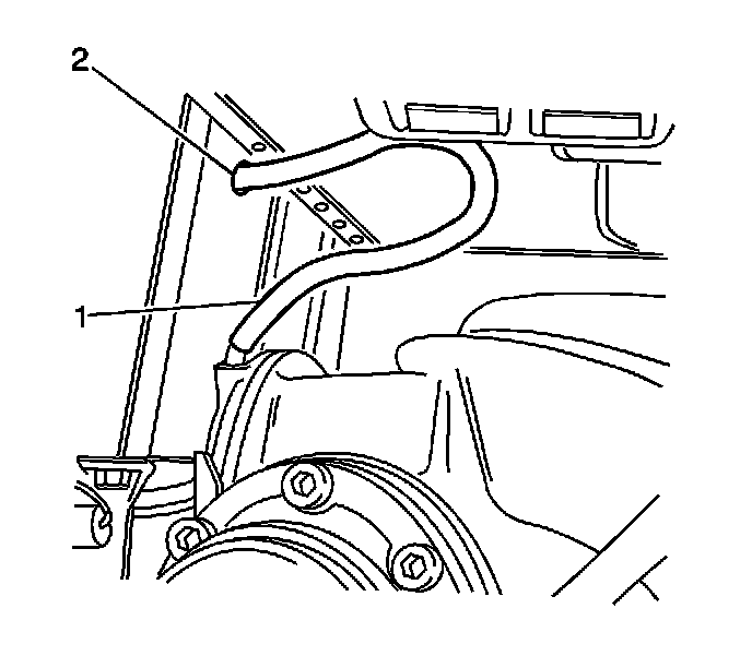 7. Pull the differential carrier breather hose (1) out of the hole (2) in the vehicle underbody rear suspension support.