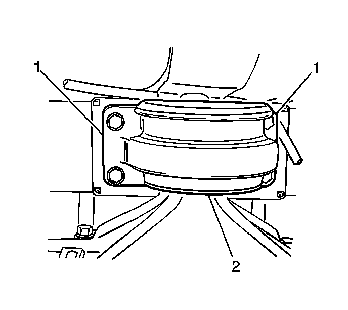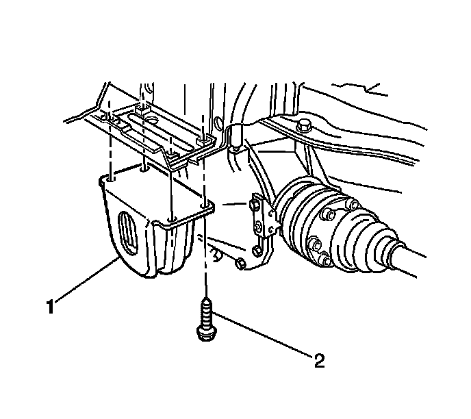 16. Install 4 new bolts (2) attaching the rear mount (1) to the vehicle underbody.