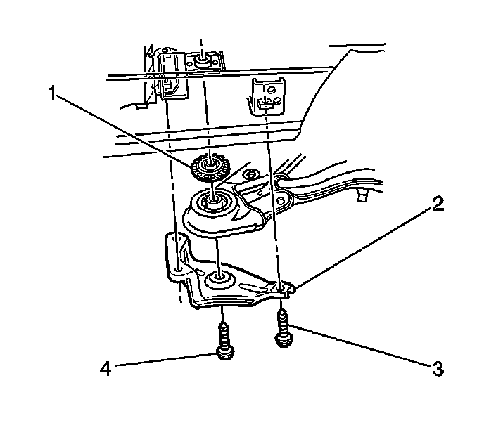 22. Locate the bolts (3) attaching the rear suspension support insulator bracket (2) to the vehicle.