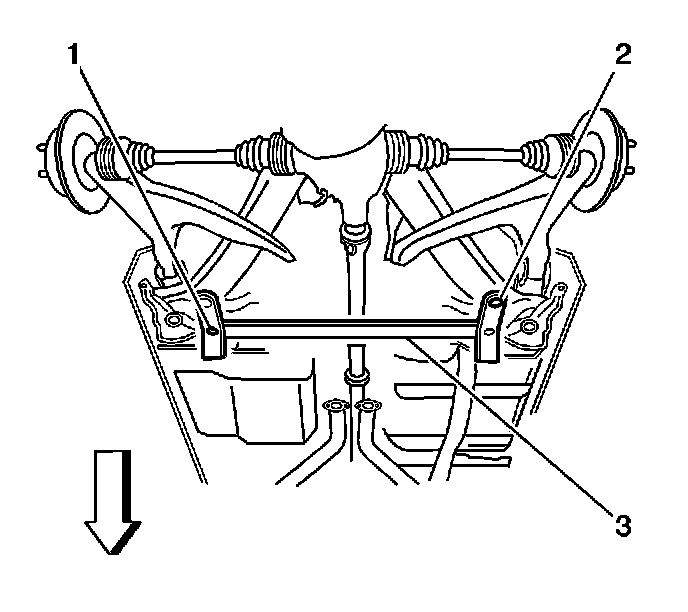 19. With the aid of an assistant, position the rear suspension support until the location pins (2) of the rear crossmember centering tool (3) engage the alignment holes on the rear suspension support assembly.