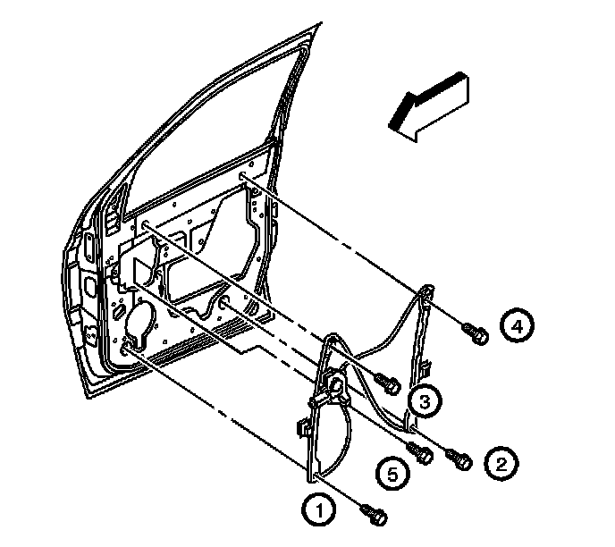 Important: In order to ensure proper orientation of the window regulator to the door, tighten the window regulator bolts in the specified sequence (1, 2, 3 ,4, 5).