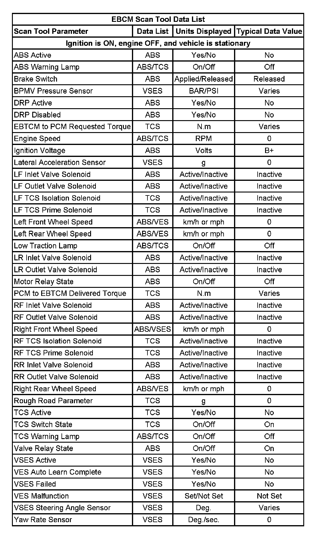 Use the EBCM Scan Tool Data Lists as directed by a diagnostic table or in order to supplement the diagnostic procedures. Begin all the diagnostic procedures with the ABS Diagnostic Starting Point. Use the EBCM Scan Tool Data Lists only after the following is determined: