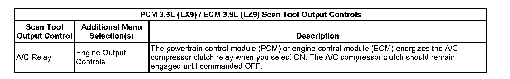 PCM 3.5L (LX9) / ECM 3.9L (LZ9) Scan Tool Output Controls: