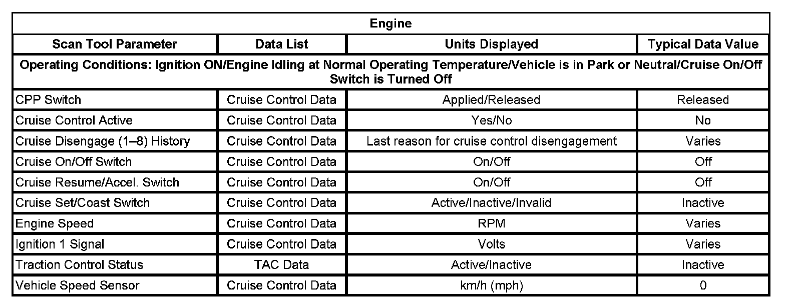 The scan tool data lists contain all of the cruise control related parameters that are available on the scan tool. The parameters in the list are arranged in alphabetical order. The data list column indicates the location of the parameter within the scan tool menu selections.