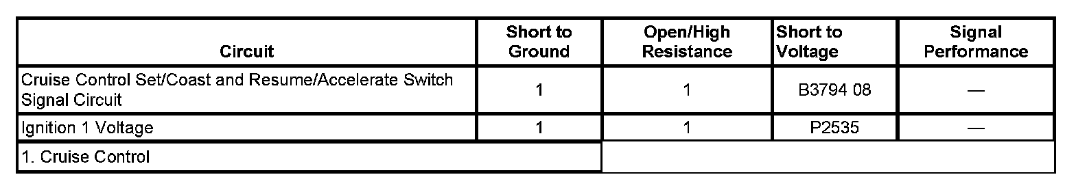 - Repair the short to voltage in the cruise control set/coast and resume/accelerate switch signal circuit.