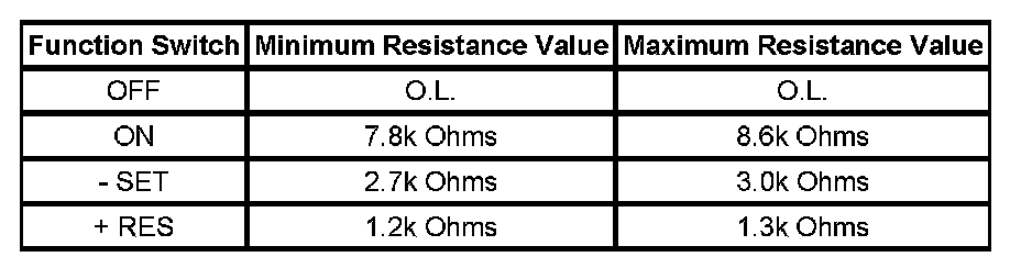 IMPORTANT: The cruise control ON/OFF switch must be ON in order to properly measure the resistance of the - SET and the + RES switches.