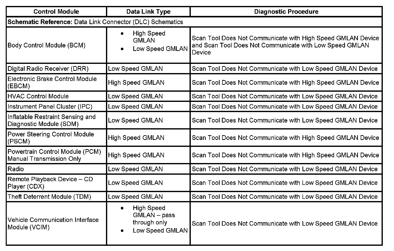 This table identifies which serial data link that a particular module uses for in-vehicle data transmission. Some modules may use more than one data link to communicate. Some modules may have multiple communication circuits passing through them without actively communicating on that data link. This table is used to assist in correcting a communication malfunction. For the description and operation of these serial data communication circuits, refer to Data Link Communications Description and Operation.