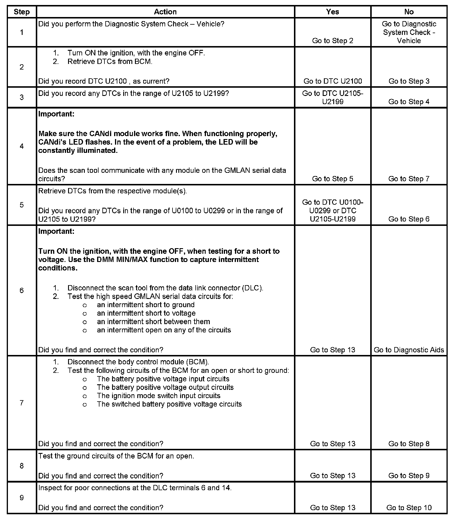 Modules connected to the high speed GMLAN serial data circuits monitor for serial data communications on the high speed GMLAN network during normal vehicle operation. Operating information and commands are exchanged among the modules. When a module detects a bus-off condition a DTC U0001, U2100 or U2104 will be set. Generally these DTCs can be retrieved as history only, with the exception of body control module (BCM) that can set DTC U2100 as current, because it communicates with the scan tool on class 2.