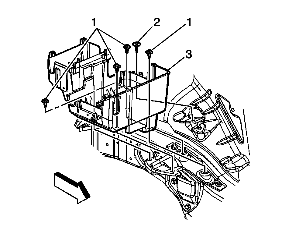 3. Install the battery box outer bolt (2) under the coolant surge tank.