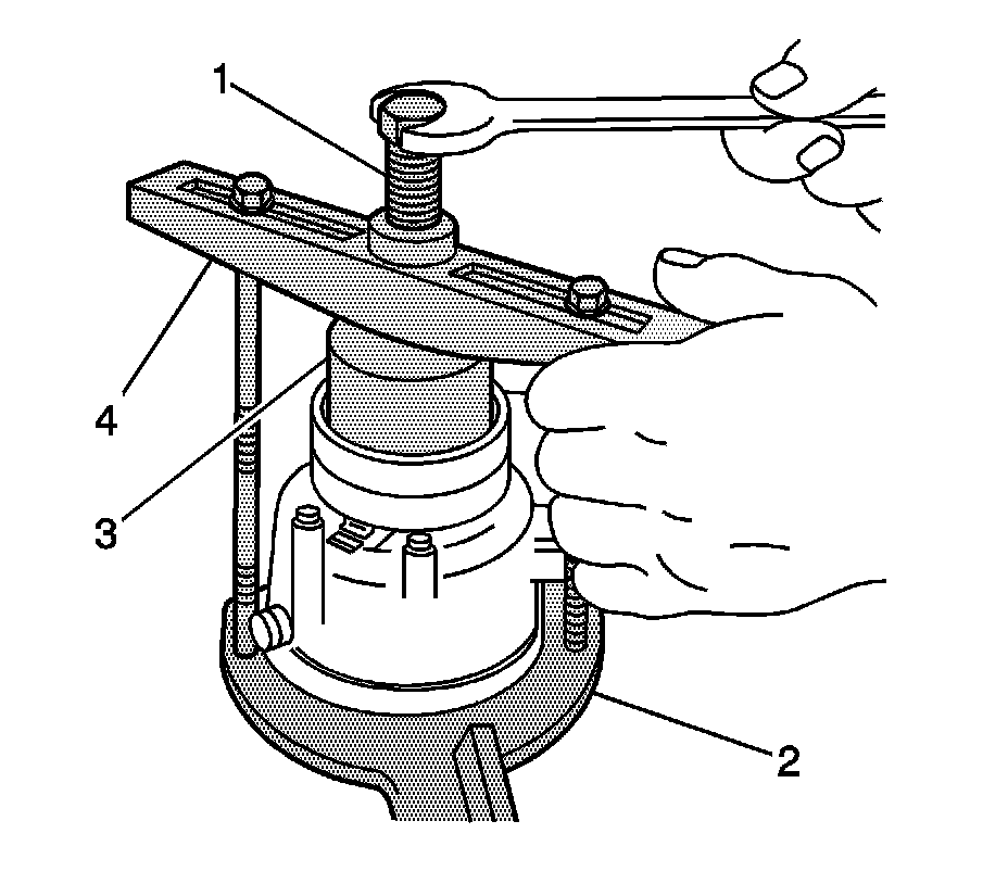 3. Center the J 8433-1 (4) in the countersunk center hole of the J 33024 (3). Install the J 42428 (2) through-bolts and the washers through the crossbar slots. Thread them into the holding fixture to the full thickness of the holding fixture.