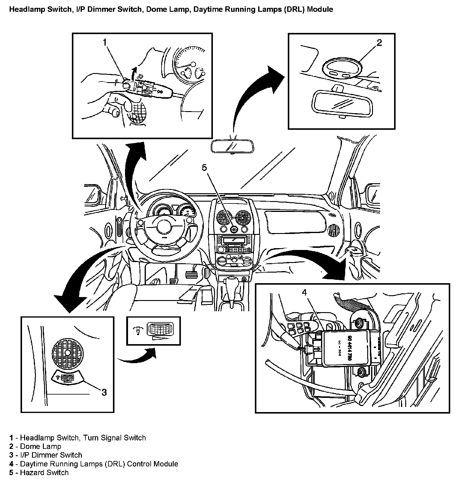 Headlamp Switch, I/P Dimmer Switch, Dome Lamp, Daytime Running Lamps (DRL) Module: