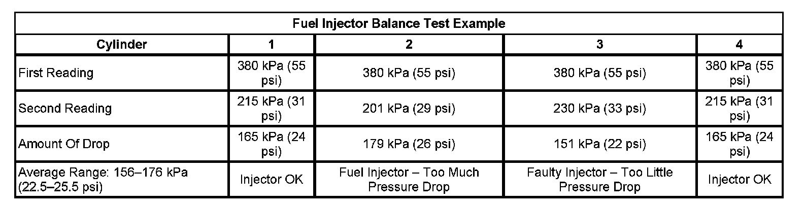 - If the difference between any individual pressure drop and the average pressure drop is more than 20 kPa (3 psi), replace the fuel injector.