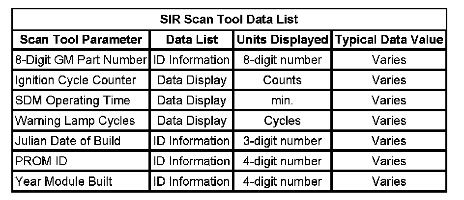 The SIR Scan Tool Data List contains all the restraint system related parameters that are available on the scan tool. The parameters in the list are arranged in alphabetical order. The column, "Data List," indicates the location of the parameter within the scan tool menu selections.